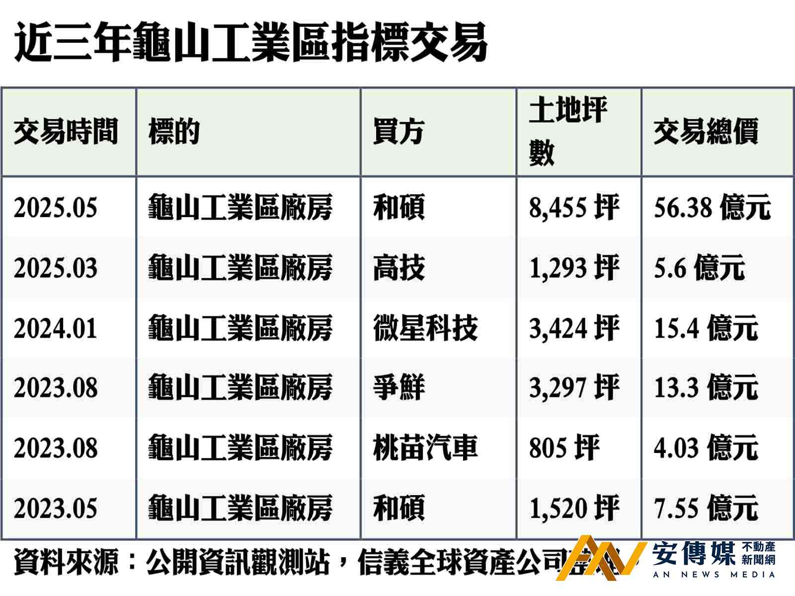 據信義全球資產公司統計,近三年上市櫃法人在桃園對廠房、工業地等工業不動產交易共達597億元,其中龜山工業區累計交易量達102億元,佔整體交易額約17%,顯示龜山工業區在桃園工業地產市場中的關鍵地位,法人積極進駐設廠,且在三大交易趨勢助攻下,龜山工業區持續磁吸資金與企業聚集。
