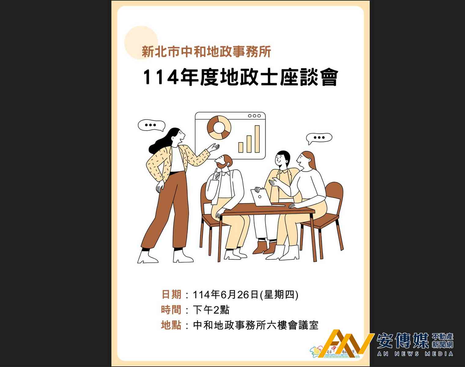 【AN不動產新聞網/劉怡霖/綜合報導】為強化與地政士間互動交流,並宣導政策與法令,新北市中和地政事務所訂於2025年6月26日(星期四)下午2點於該所六樓會議室(中和區復興路278號6樓)舉辦2025年度地政士座談會,歡迎地政士及不動產相關從業人員踴躍參加。