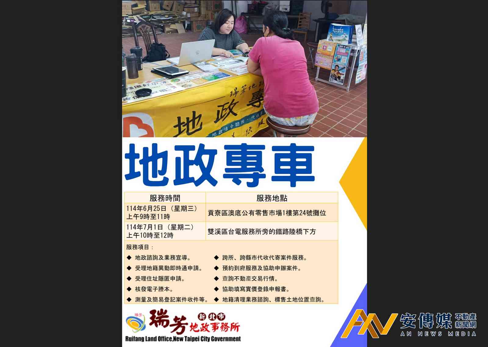 【AN不動產新聞網/劉怡霖/綜合報導】為了提供更便利、貼心的地政服務,新北市瑞芳地政事務所「地政專車」即將出隊服務囉!本次服務將於2025年6月25日(星期三)上午9點至11點,於貢寮區澳底公有零售市場1樓第24號攤位定點服務;另於7月1日(星期二)上午10點至12點,在雙溪區台電服務所旁的鐵路陸橋下方定點服務,歡迎市民朋友多加利用!