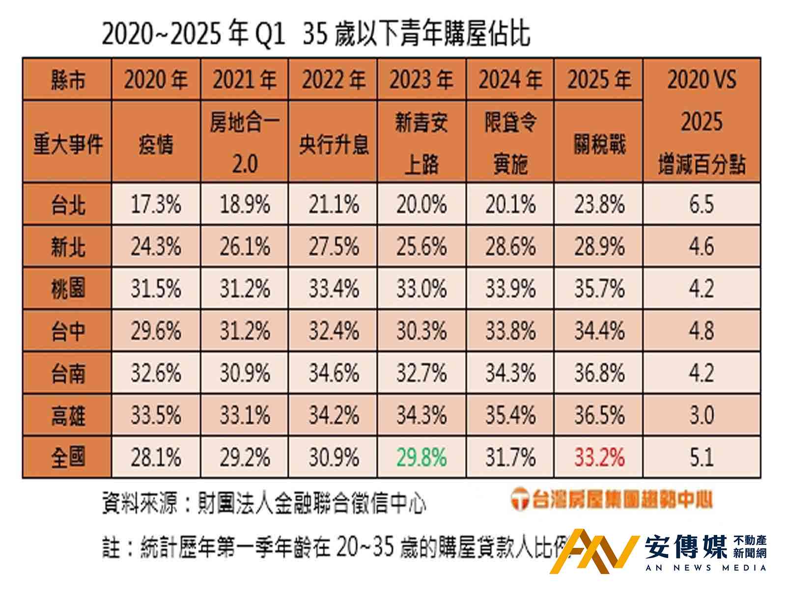 【AN不動產新聞網/蕭又安/綜合報導】台灣房屋集團趨勢中心根據聯徵中心資料統計,2025年第一季全台35歲以下購屋族貸款,佔比達33.2%,也就是每3位購屋貸款人當中,就有一人是35歲以下的青年,其中六都除雙北外,其餘四都青年佔比都高於全國,尤其是台南、高雄青年的貸款佔比來到36%以上,已至少是近6年新高,使南二都成為「最敢買」的年輕族群代表。不過,市場人士指出,這樣的統計數據裡,「有多少比例是父母出錢買、登記孩子名下」比較難查核,這樣的數據也不能證實「現在年輕人買房能力越來越強」。