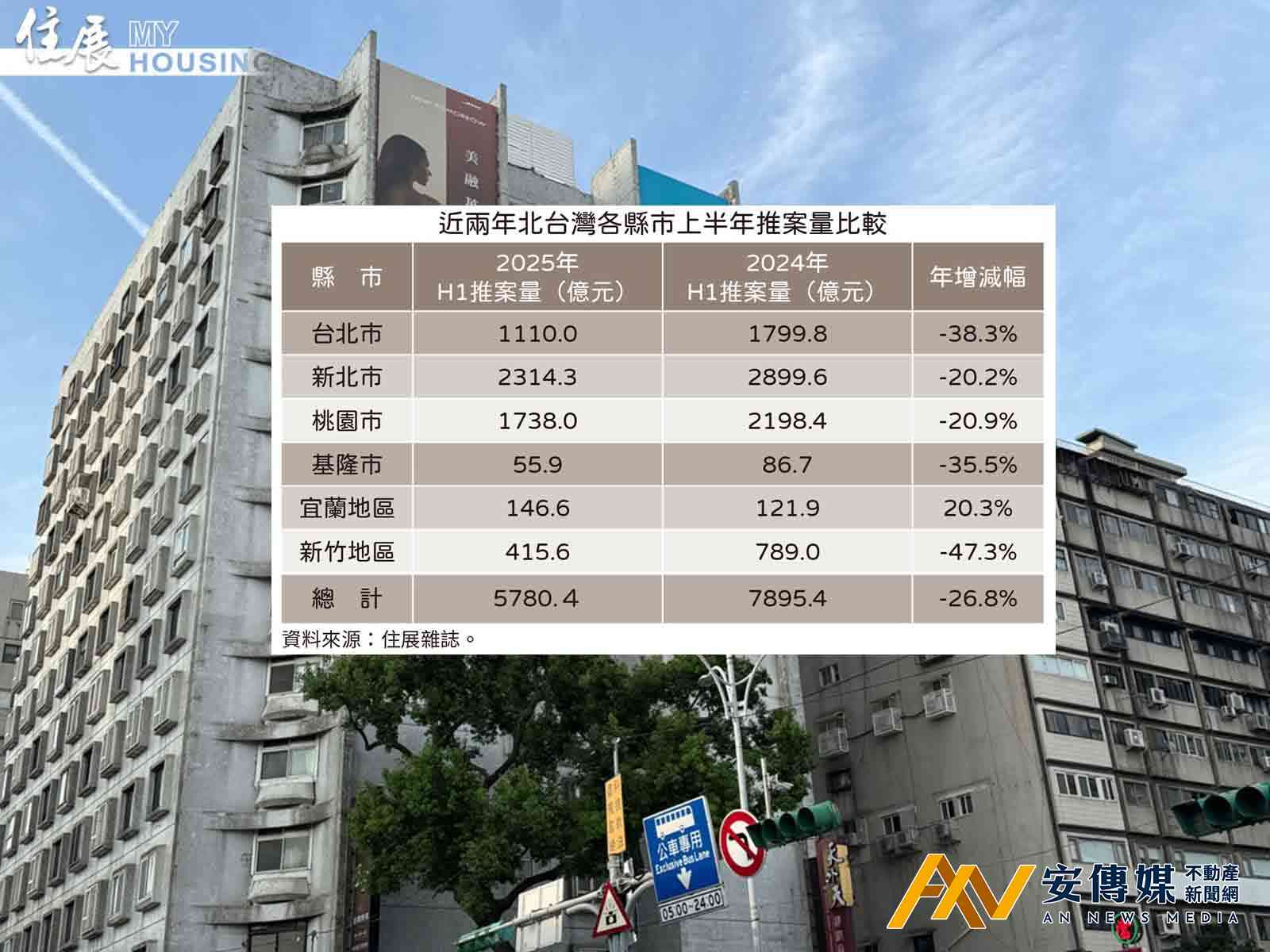 【AN不動產新聞網/蕭又安/綜合報導】住展雜誌統計2025年上半年北台灣新成屋、預售屋推案量,合計約5780.4億元,較2024年同期減少2115億元,減幅26.8%。各縣市中僅宜蘭地區一枝獨秀有20.3%的增幅,而新竹地區、台北市衰退最多,年減幅為47.3%與38.3%。