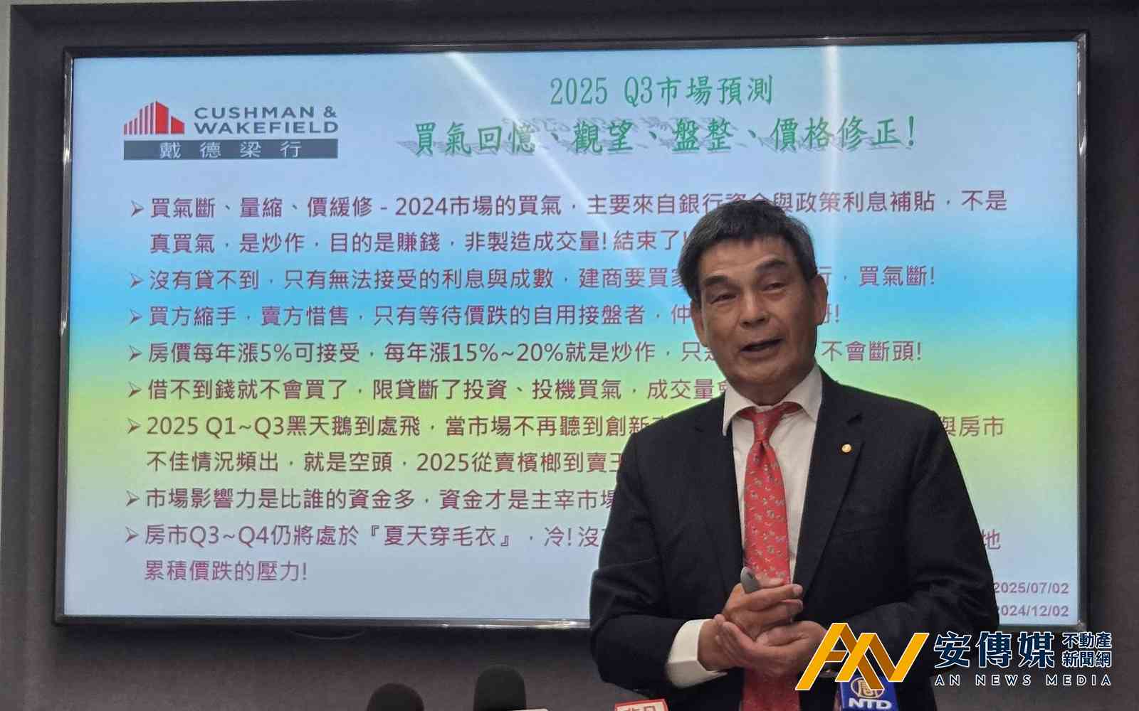 【AN不動產新聞網/蕭又安/專題報導】從北中南一路喊出「降價讓利」的建商,真的是賠本求售?還是另有盤算?在戴德梁行2025年7月2日上半年房地產市場報告中,有「房市總司令」之稱的戴德梁行董事總經理顏炳立一句話點破真相,他指出,建商從來不做賠錢生意,現在只是把開太高的價格『還原』,回到合理利潤。