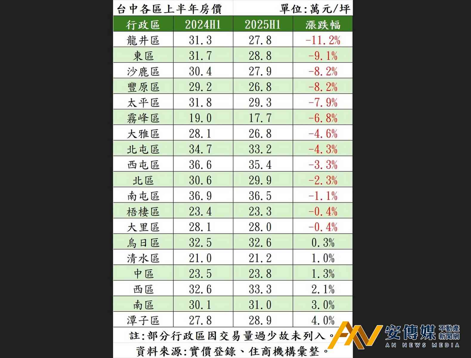 據實價登錄統計,台中市龍井區2025年上半年平均成交單價約27.8萬元,相比2024年同期成交單價31.3萬元,一年跌幅達11.2%,為台中跌幅最大行政區;此外,同為台中海線的沙鹿上半年平均成交單價約27.9萬元,相較2024年同期下修8.2%;不僅海線出現盤整,市中心的東區上半年平均單價行情約28.8萬元,但比較2024年同期,區位價格跌幅也達9.1%,排名各行政區中的第二名;另外,台中山線行政區如豐原、太平及霧峰區,上半年房價相對2024年同期,也有6~8%等不同程度的跌勢出現;至於以往為台中房市發展重心的北屯、西屯以及南屯等區域,也出現1~4%不等的下修。