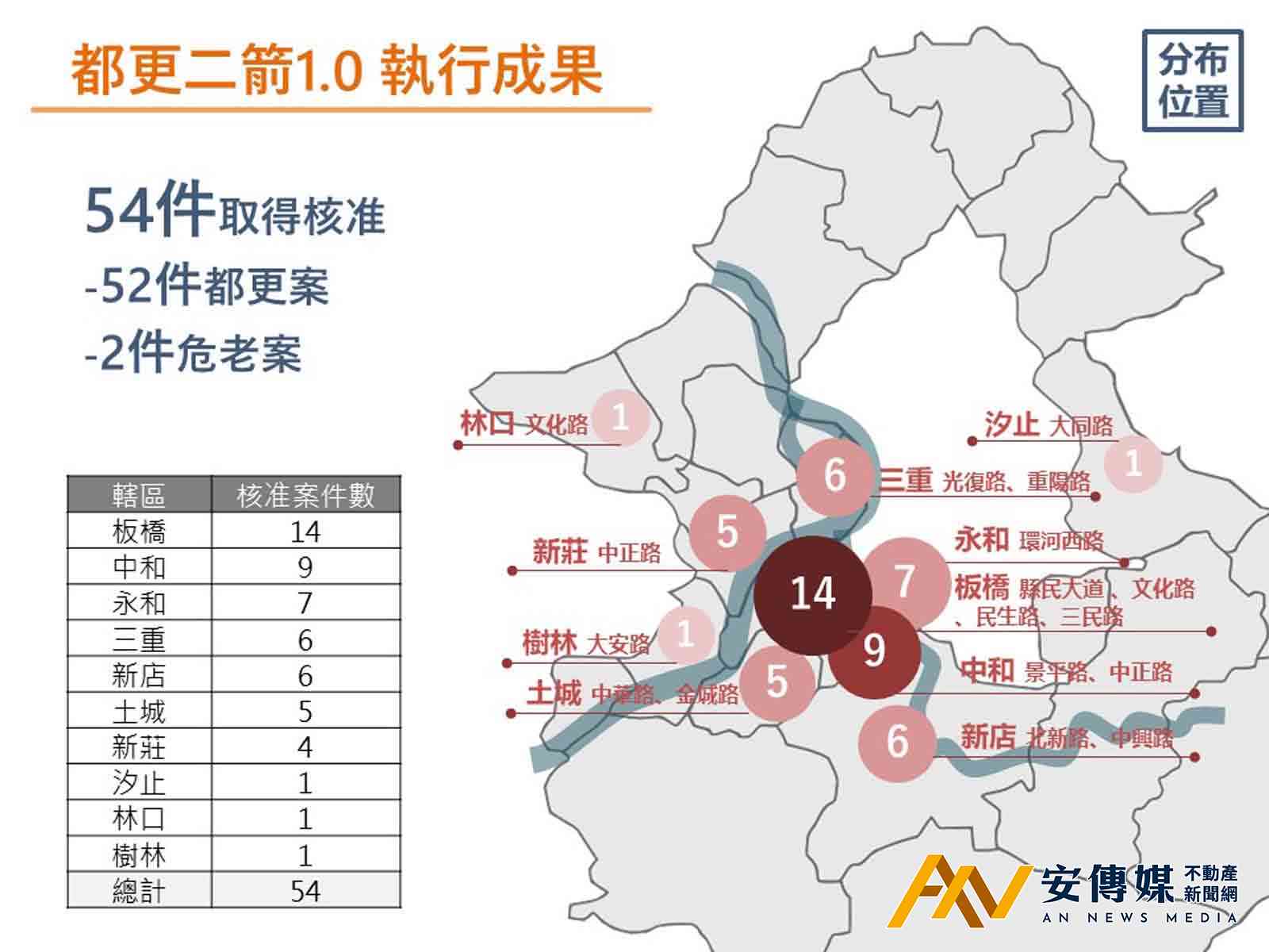 新北市政府城鄉發展局表示,都更二箭1.0政策執行成果,共計54件取得容積加給核准,包含板橋14件、中和9件、永和7件、三重及新店各6件、土城5件、新莊4件,汐止、林口、樹林各1件,且核准熱區主要分布於板橋縣民大道、文化路、民生路及三民路、中和景平路及中正路、永和環河西路、新店北新路及安和路、土城中華路及金城路、三重光復路及重陽路、新莊中正路等主幹道沿線。