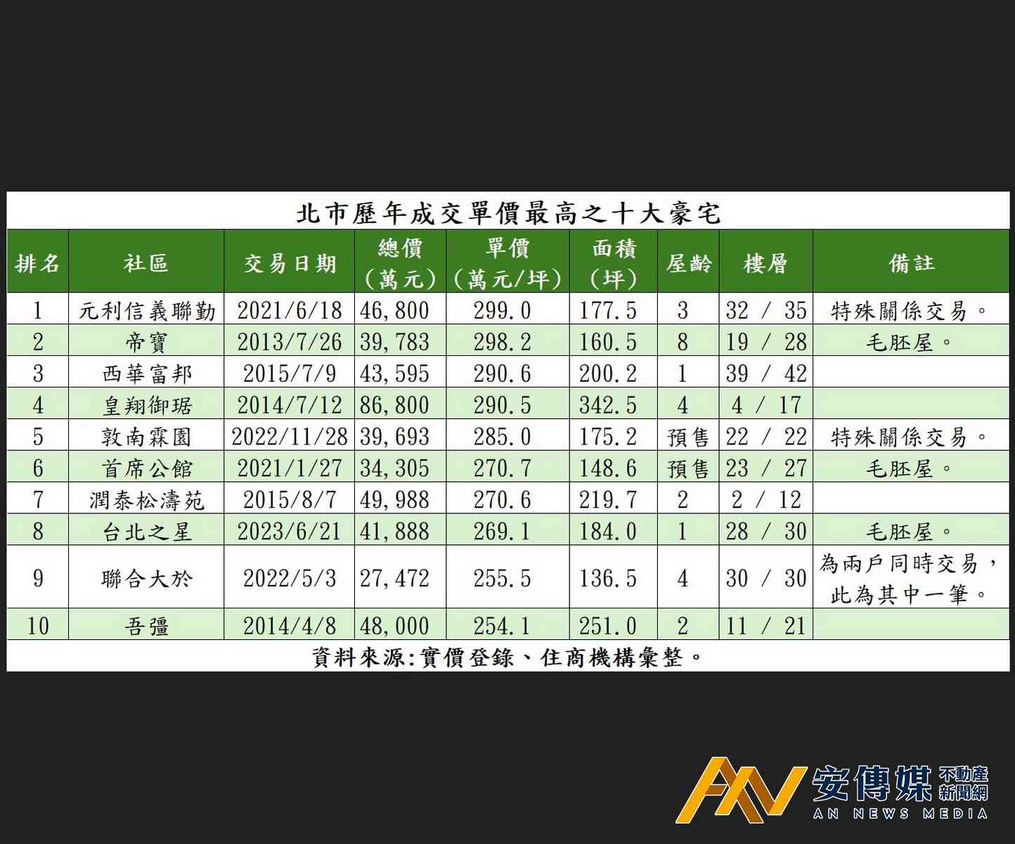 【AN不動產新聞網/蕭又安/綜合報導】日前北市豪宅「Diamond Towers 台北之星」甫傳政府持有的18戶標租案,全數流標,惟近期實價再傳新高單價紀錄。住商機構觀察實價登錄最新揭露,該豪宅28樓2023年6月時,以每坪單價約269萬元成交,使該社區榮登十大豪宅之林。大家房屋企劃研究室公關主任賴志昶分析,該交易為私法人趕在《平均地權條例》修法前夕成交,價格雖貴卻也在合理範圍,惟近期市場前景不明,該社區日後續創高價與否,關鍵仍端看政策態度。