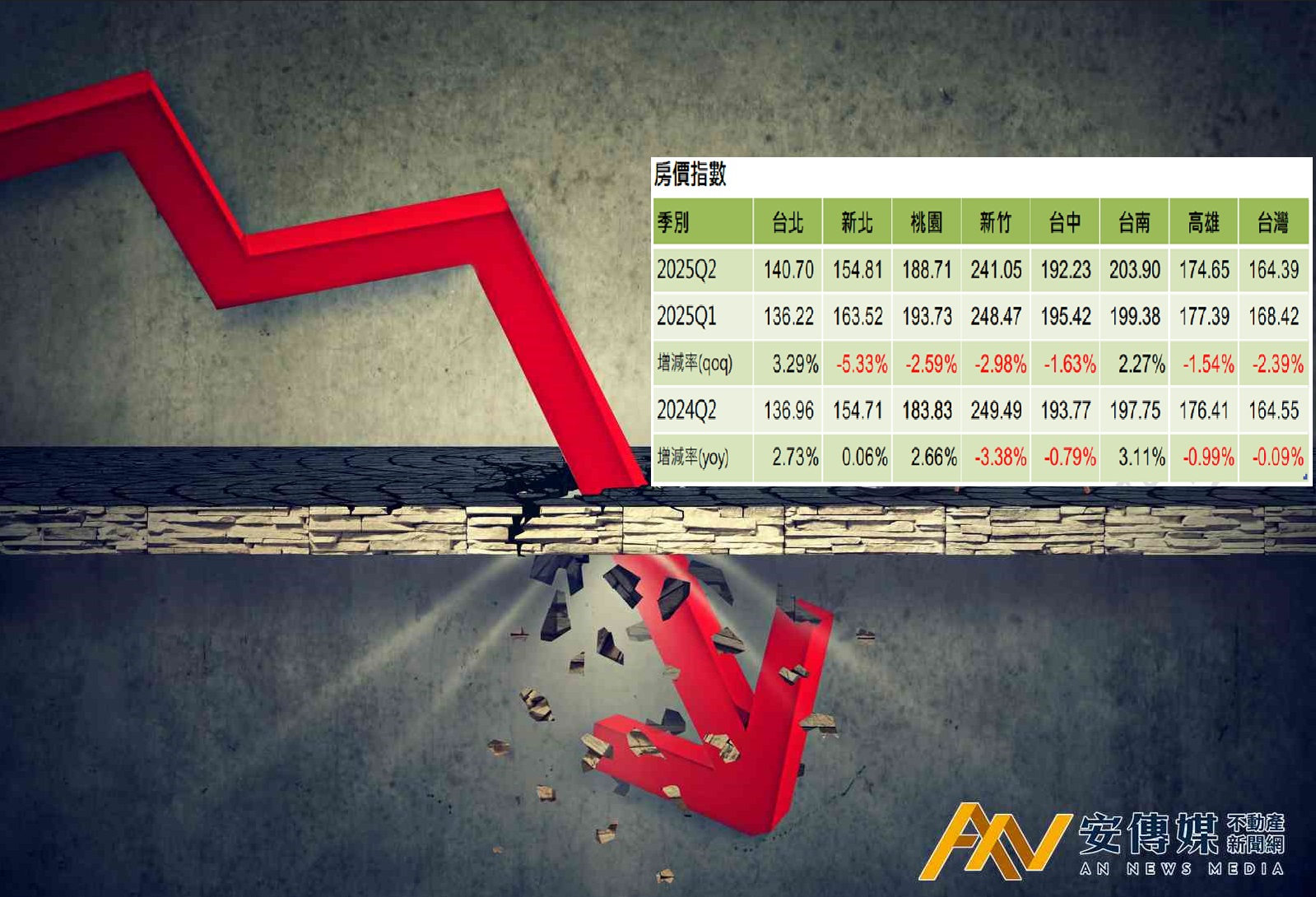 【AN不動產新聞網/蕭又安/綜合報導】2025年第2季信義房價指數季指數六都+新竹部分,除台北及台南出現反彈走勢外,其餘各都房價指數季變動均出現下滑跡象,其中新竹、台中及高雄均出現連二季下行走勢,新北及桃園均自Q1的歷史高點反轉下修,整體房價與2024年同期相當,顯示房價已經脫離連續創高走勢,開始進入盤整期。