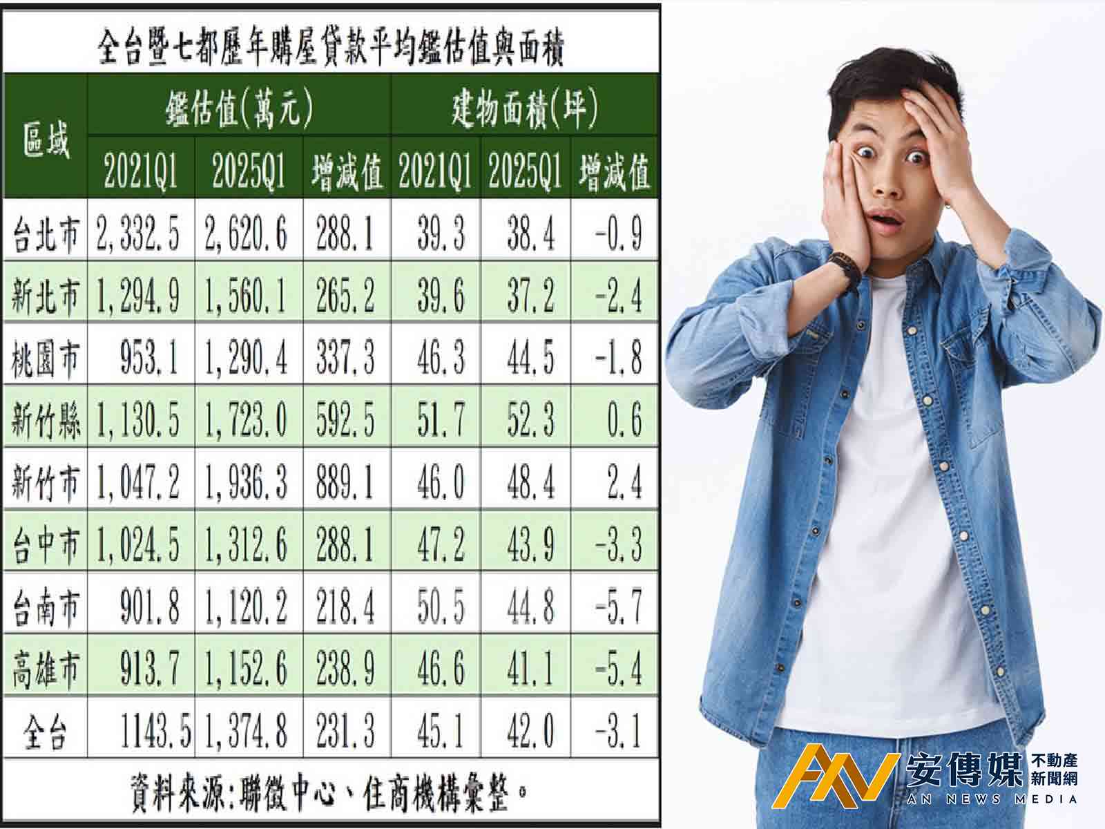 【AN不動產新聞網/蕭又安/綜合報導】全台近期買氣大減,惟房價仍是顯著成長。住商機構觀察聯徵中心統計,全台首季購屋人平均鑑估值與2021年同期相比增加231.3萬元,不過平均購屋面積卻減少3.1坪,換言之,民眾若晚5年買房,除得多付2百餘萬元,同時少買一間3坪大空間。大家房屋企劃研究室公關主任賴志昶分析,疫情後房價走高,惟民眾所能負擔的總價帶不變情況下,無奈的購屋人只能越買越貴、越買越小。