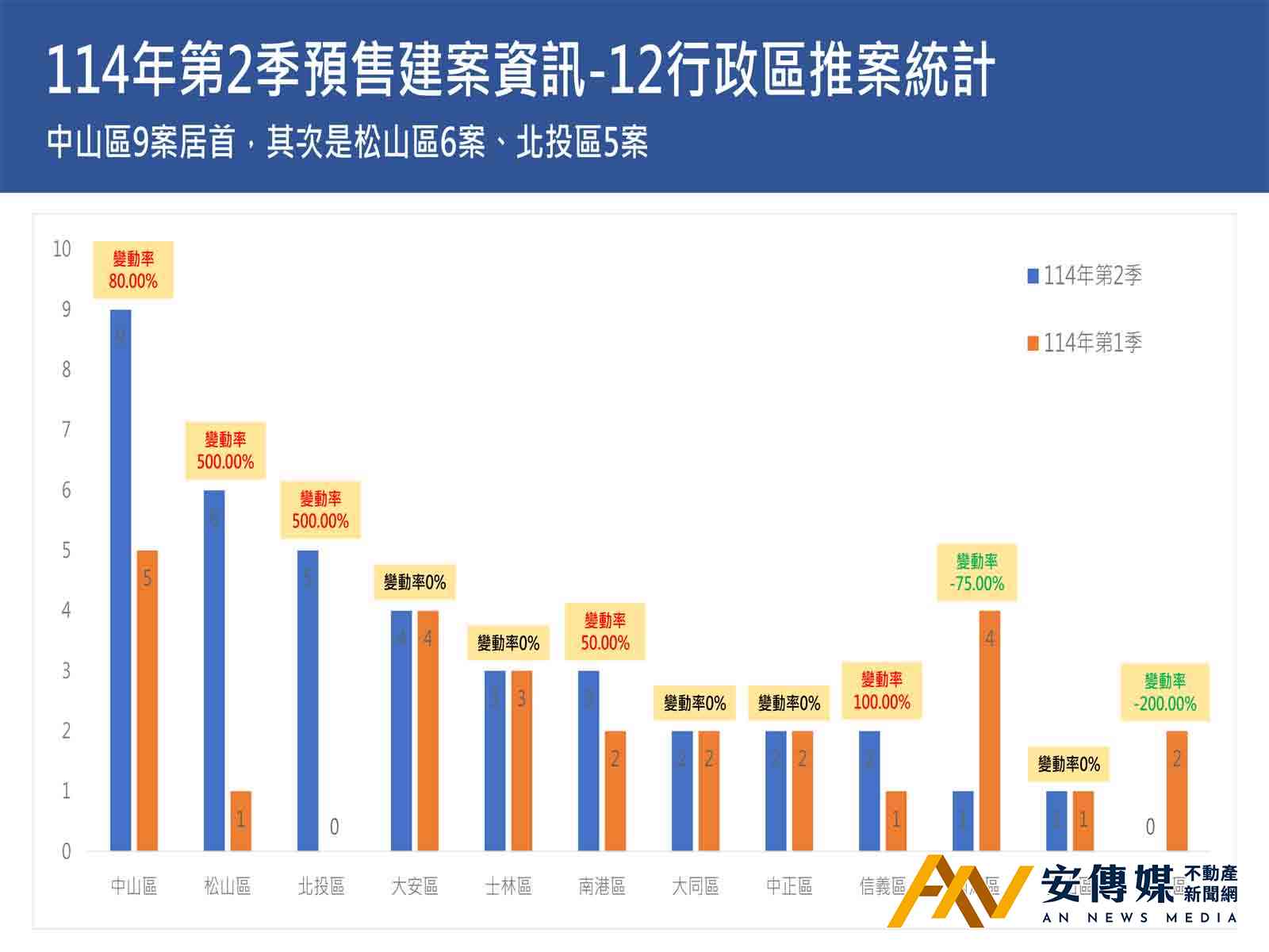 【AN不動產新聞網/劉怡霖/綜合報導】台北市2025年第2季全市申報備查的預售建案共計38案,較前期27案增加40.74%,較2024年同期33案增加15.15%;累計年申報數131案,較前期126案增加3.97%,較2024年同期109案增加20.18%。
