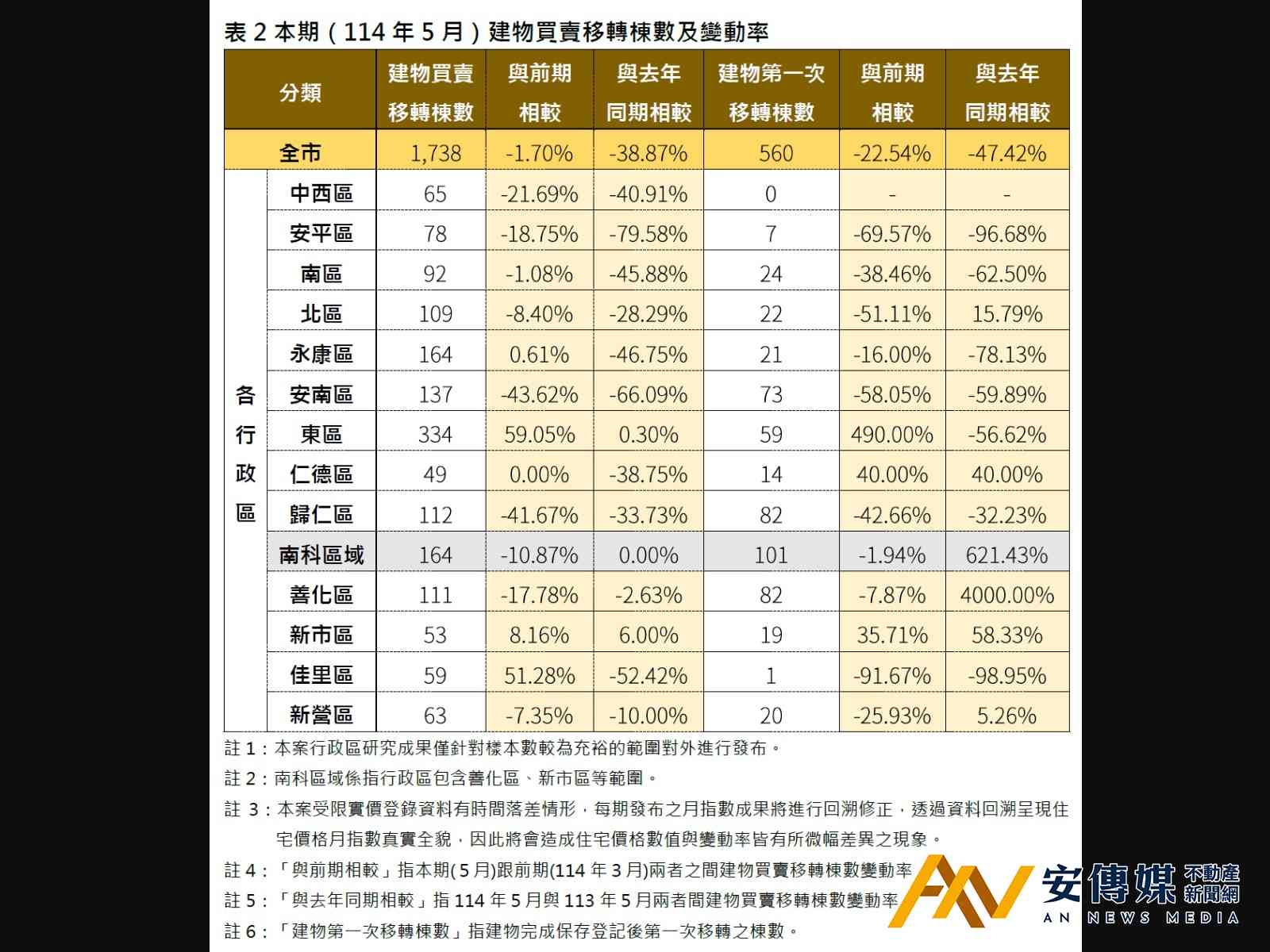 年度比較方面,南區漲幅最高達3.46%,新營區上漲3.04%居次,中西區漲1.59%排第三。不過與2024年同期相比,多數區域交易量大幅下滑,僅新市區及東區微幅增加6.00%及0.30%。