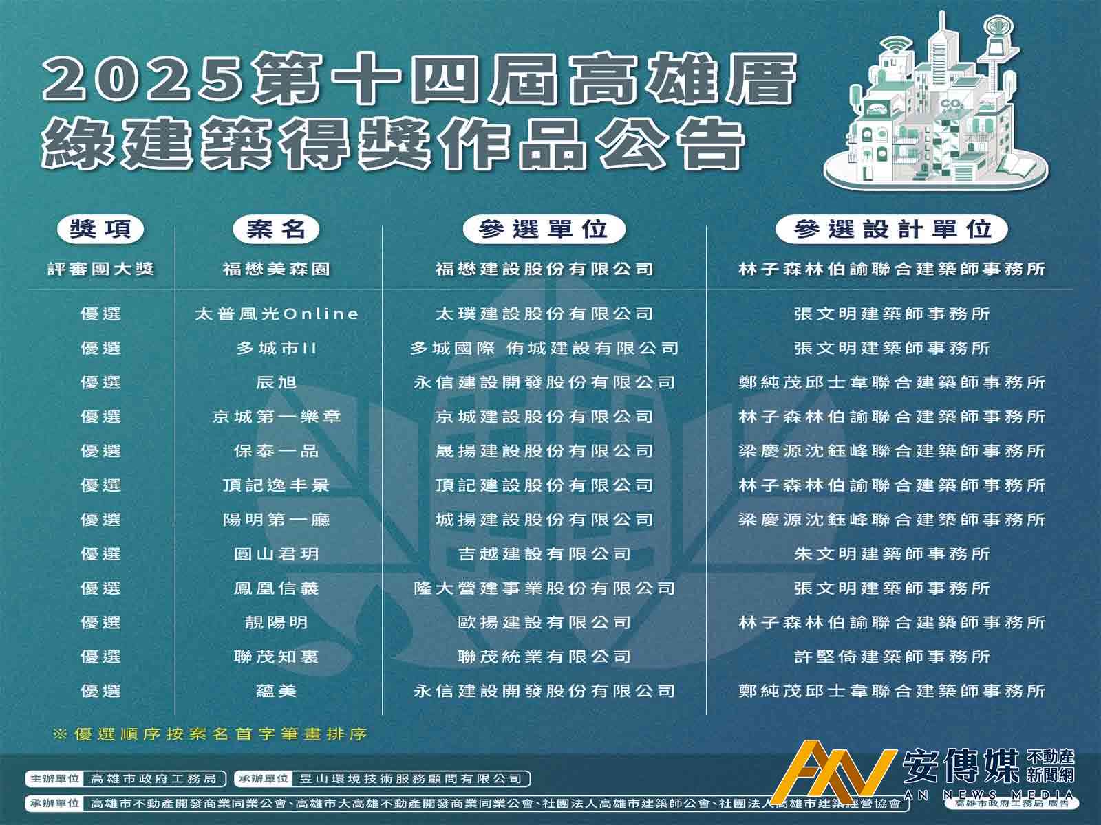 【AN不動產新聞網/劉怡霖/綜合報導】高雄市政府工務局2025年8月6日公布第14屆高雄厝綠建築優良作品獲獎名單,2025年共13件作品參賽,由福懋建設「福懋美森園」榮獲評審團大獎,另有12件作品獲得「優選」殊榮,分布於三民、左營、仁武、楠梓等8個行政區,充分展現高雄厝低碳、宜居的建築精神。