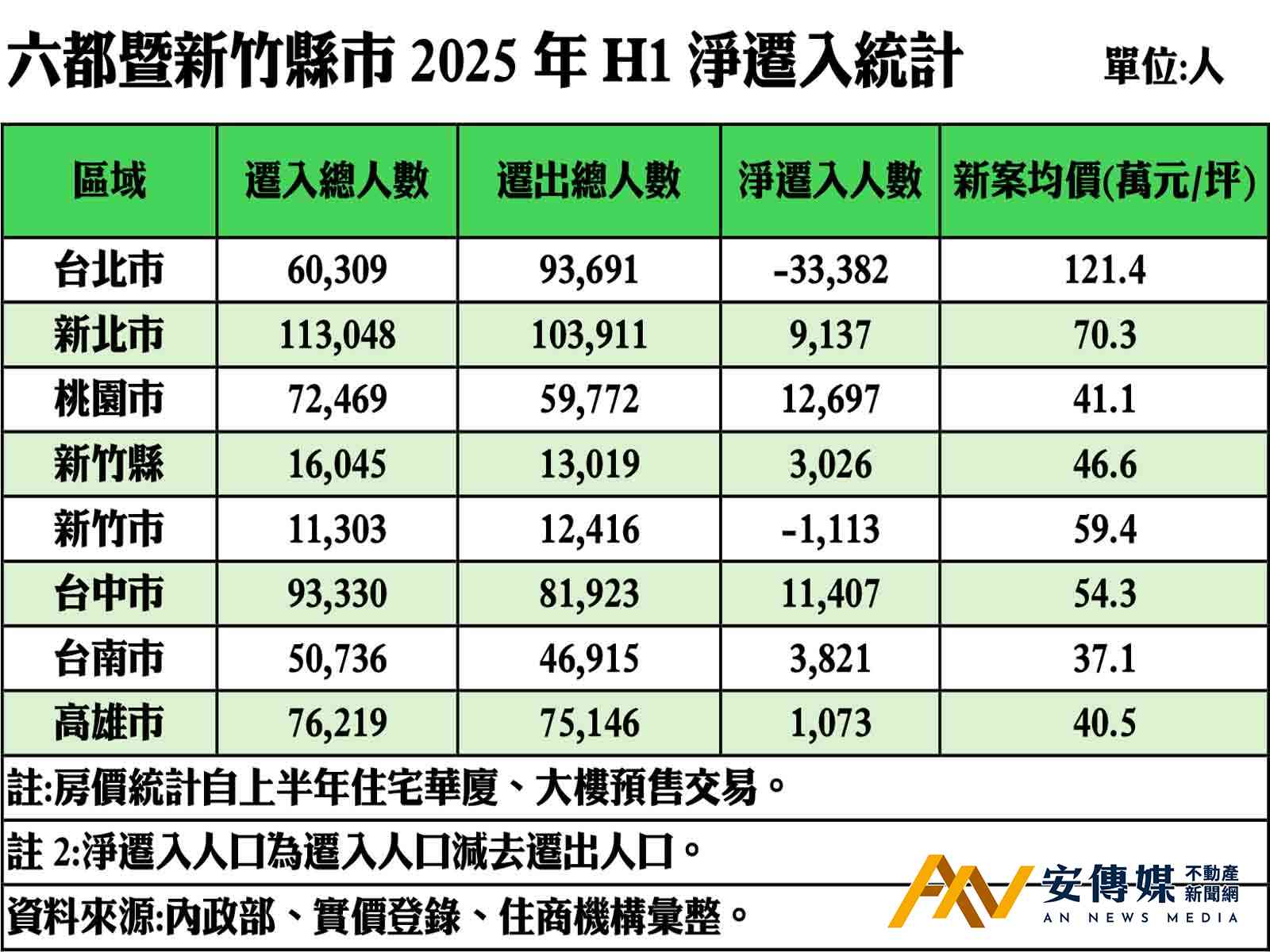 【AN不動產新聞網/蕭又安/綜合報導】房價成為人口流動風向球!住商機構最新統計內政部數據發現,2025年上半年台北市淨遷出人口高達3.3萬人,等同於可塞滿3座台北小巨蛋,創下全台各縣市最高紀錄。專家分析,北市房價已突破每坪121萬元天價,加上周邊交通建設完善,正加速「脱北者」湧現,重塑北部居住版圖。