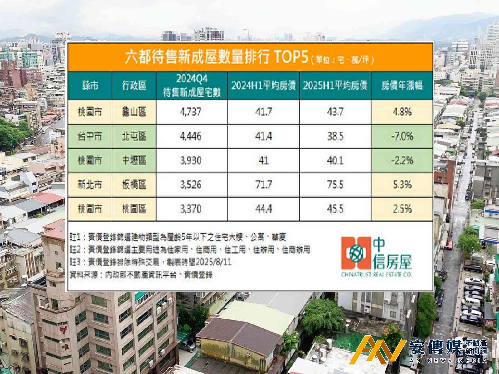 【AN不動產新聞網/蕭又安/綜合報導】房市降溫效應持續發酵!內政部最新統計顯示,2024年第4季全台待售新成屋住宅數量達111,085宅,首度突破11萬宅大關,寫下歷史新高紀錄,凸顯建商正面臨嚴峻的去化壓力。從六都各行政區排名來看,桃園市龜山區以4,737宅高居榜首,台中市北屯區4,446宅居次,桃園市中壢區3,930宅排第三,新北市板橋區3,526宅、桃園市桃園區3,370宅分居四、五名。中信房屋研展室副理莊思敏分析,這些餘屋集中的區域,多為過去幾年重劃區開發熱絡、推案量龐大的地區,隨著房市明顯降溫,新成屋賣壓也相對加重。