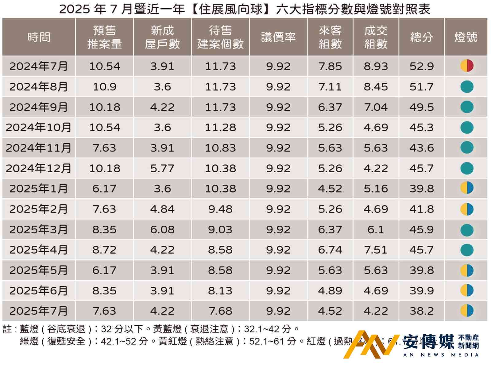 【AN不動產新聞網/蕭又安/綜合報導】代表北台灣新建案市場的「住展風向球」7月持續亮出黃藍燈,得分38.2分,創下新冠疫情後最低紀錄,為2025年第5顆黃藍燈。六大構成項目呈現「一升、一平、四降」格局,顯示房市景氣持續低迷。住展雜誌企研室總監陳炳辰指出,7月預售屋推案量較前月大減百億元,僅剩600多億元,反映建商在暑假、颱風季、民俗月及關稅政策等多重利空下採保守策略。
