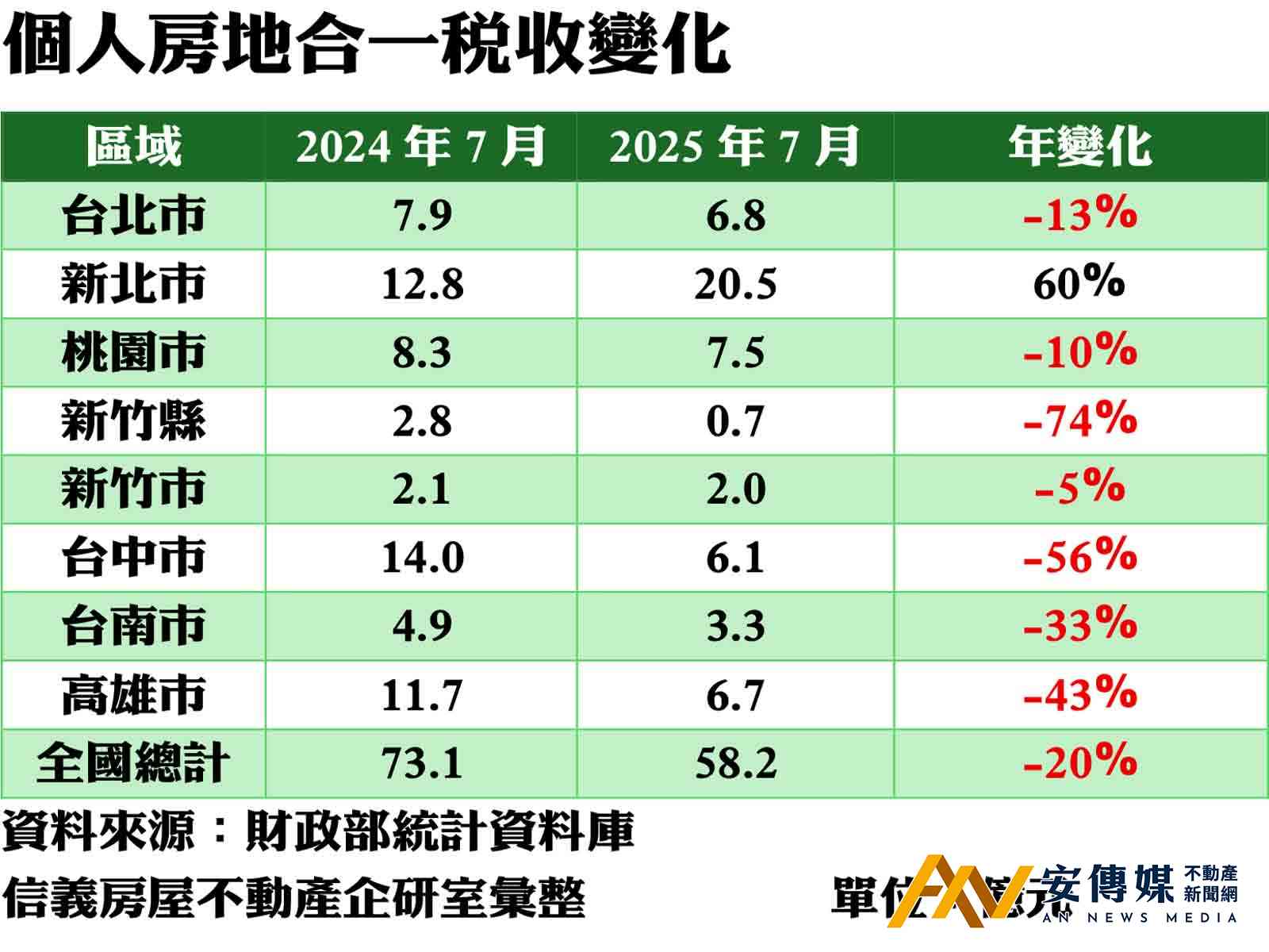 【AN不動產新聞網/蕭又安/綜合報導】7月全國房地合一稅收達58.2億元,創下2025年單月最高紀錄,但較2024年同期仍減少20%。除新北市大幅成長外,其餘都會區稅收均呈現年減,反映房市交易量萎縮對稅收的直接影響。