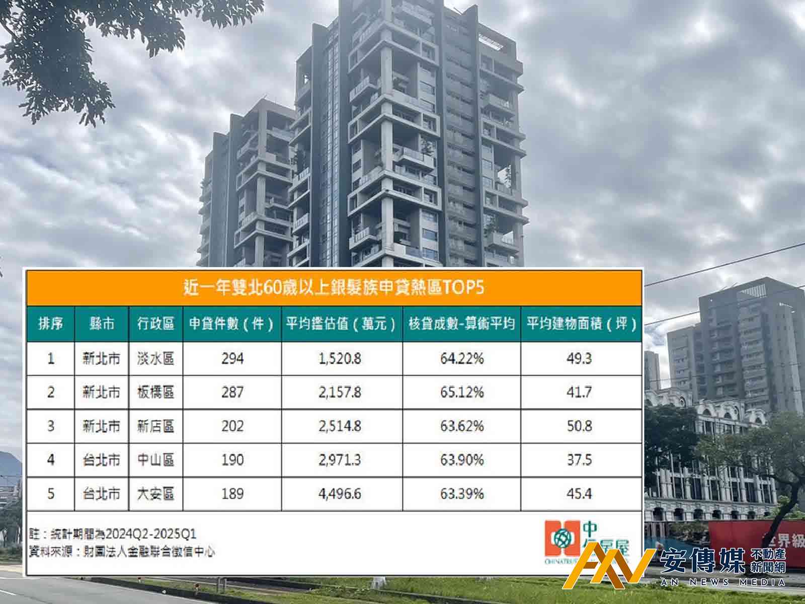 【AN不動產新聞網/蕭又安/綜合報導】隨著台灣邁向超高齡社會,銀髮族購屋需求持續升溫。根據中信房屋研展室最新統計財團法人金融聯合徵信中心資料顯示,雙北地區60歲以上銀髮族近一年新增房貸申請件數,以新北市淡水區294件居冠,成為銀髮購屋最熱門區域。
