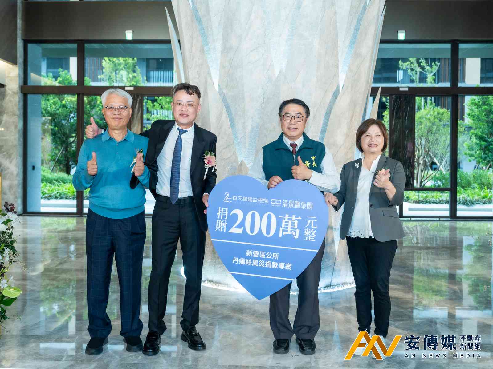【AN不動產新聞網/蕭又安/綜合報導】清景麟集團2025年8月20日20日於「研森」舉辦捐贈記者會,由集團創辦人林聰麟與白天鵝建設機構董事長陳清堯共同宣布捐贈新台幣200萬予新營區公所,援助近期風災台南市受災戶及受災農民。記者會邀請台南市長黃偉哲代表受贈,展現中央、地方與企業齊心賑災的決心。