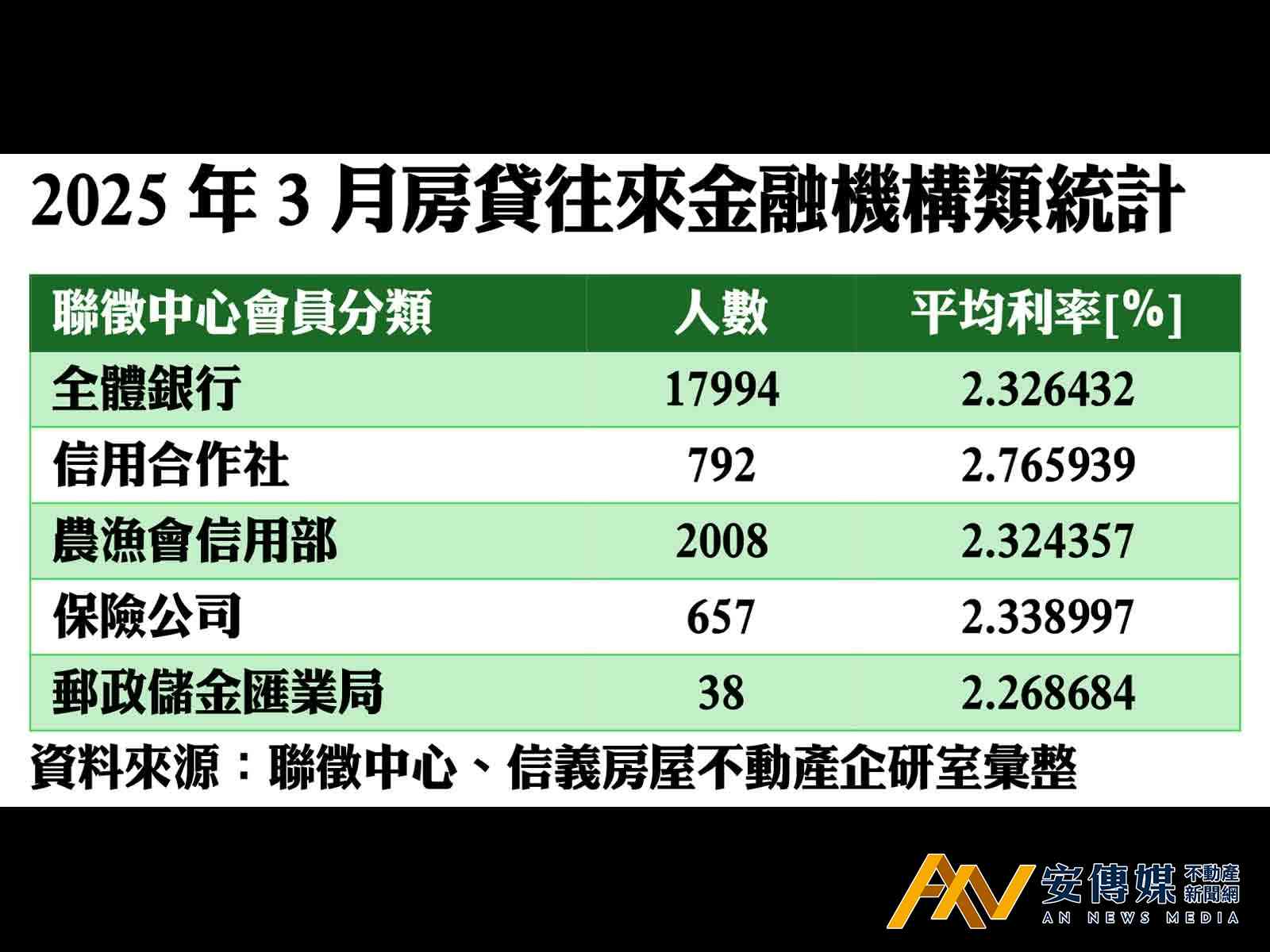 回顧歷史高峰,2013年景氣熱絡時期,保險公司單月新增房貸量曾達3300多件,隨後業務量逐年縮減,直至2023年初降至最低點。在利率方面,2025年3月全體銀行平均房貸利率為2.326%,信用合作社2.76%,農漁會2.32%,保險公司則為2.34%,利率水準與主要競爭對手相當接近。