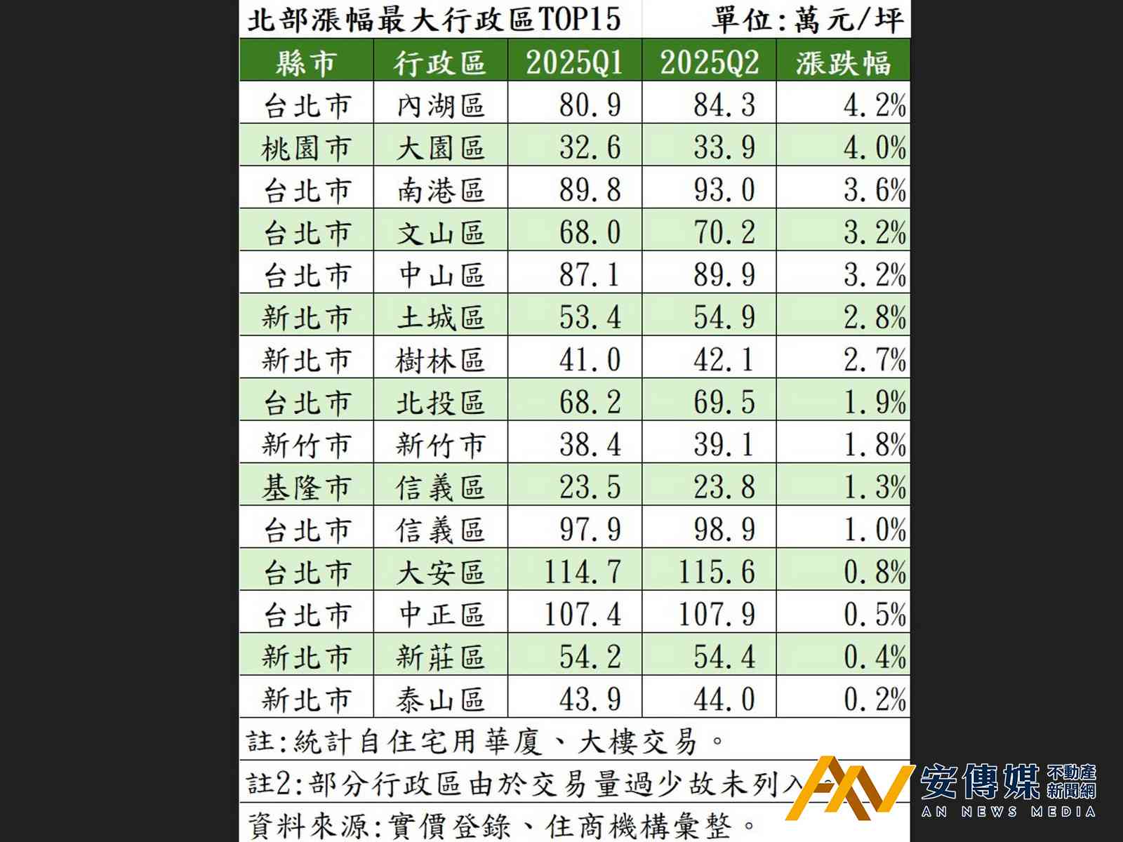 根據住商機構統計台北市、新北市、桃園市、新竹縣市及基隆市各行政區第2季平均成交單價,與第1季相比,台北市內湖區以單季漲幅4.2%拔得頭籌,第2季平均成交單價達84.3萬元。南港區、中山區與文山區緊追在後,漲幅約3%左右,信義、大安、中正、北投等精華區也有0.5%至1.9%的小幅漲勢。值得注意的是,此次進榜的15個行政區中,台北市就占了8個席次,顯示首都核心區域仍具相當抗跌實力。