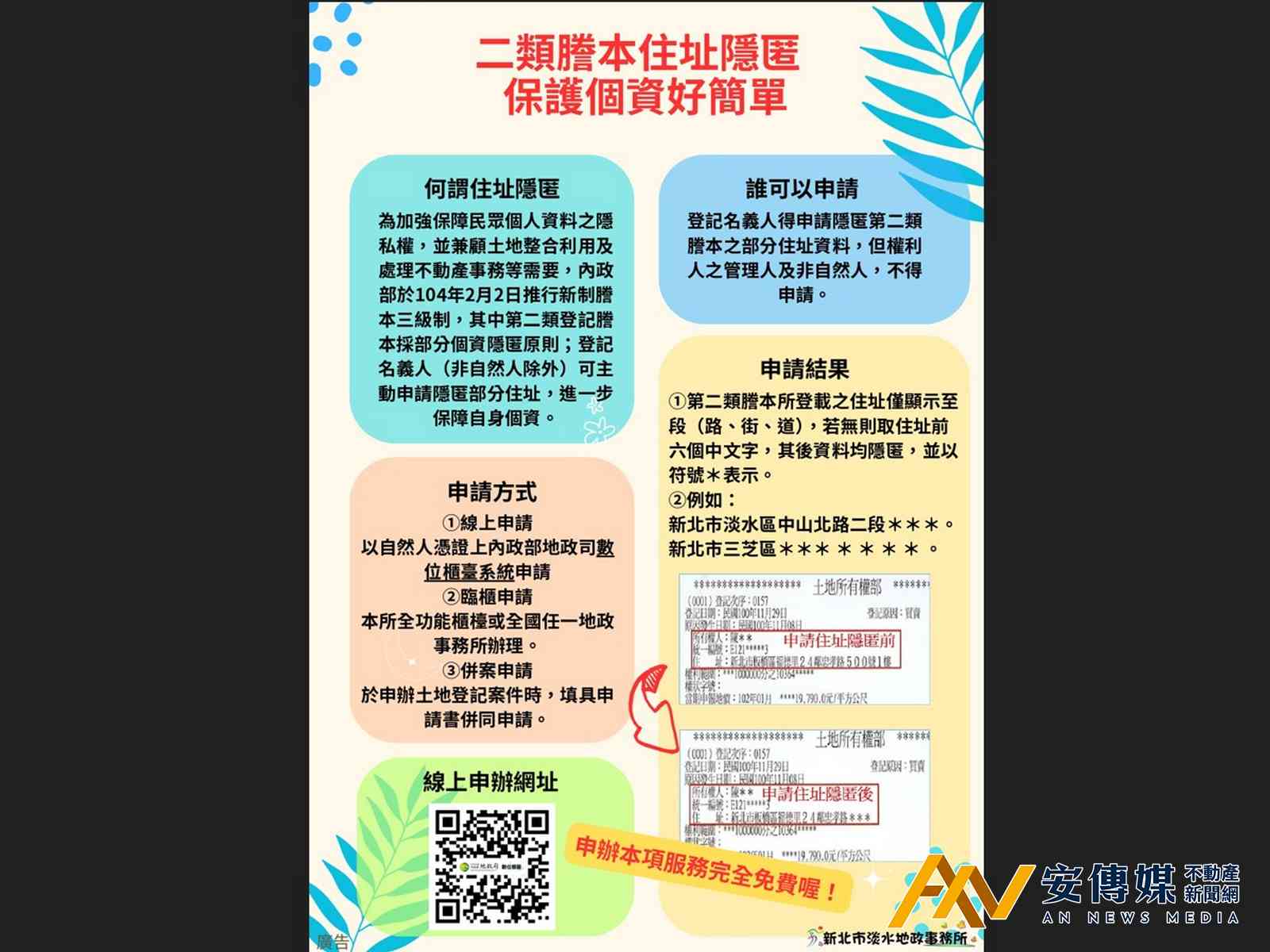 【AN不動產新聞網/劉怡霖/綜合報導】為兼顧不動產交易安全及個人資料隱私保護,內政部自2015年2月起推辦「地籍謄本申請住址隱匿」服務。新北市淡水地政事務所主任廖俊隆表示,民眾若擔心第二類謄本住址資料遭不當利用,可透過臨櫃或網路方式申請部分住址隱匿。