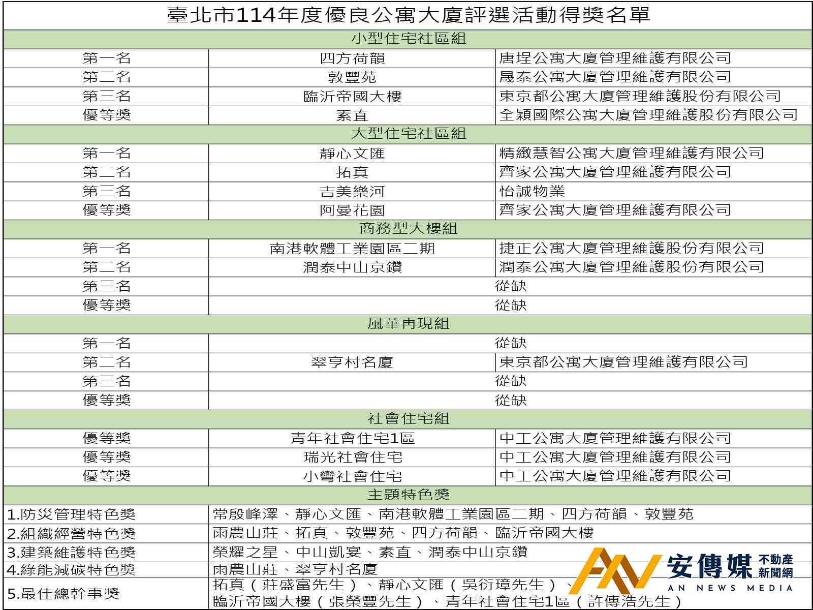 【AN不動產新聞網/劉怡霖/綜合報導】2025年台北市優良公寓大廈評選活動共計45組社區報名參加,經過評選委員會確認計有33組社區進入複選,再經市政府遴聘府內外13位專家學者至社區實地評選,最終由「四方荷韻」、「靜心文匯」、「南港軟體工業園區二期」分別獲得小型住宅社區組、大型住宅社區組及商務型大樓組第一名,並由「青年社會住宅1區」、「瑞光社會住宅」及「小彎社會住宅」獲得社會住宅組優等獎。各組前三名分別可獲得獎座1座及獎金新台幣5萬元、3萬元、2萬元,優等獎則可獲頒獎金新台幣1萬元及獎狀1面,另為鼓勵發展自身社區獨特的特色,特別頒發主題特色獎,可獲頒獎金新台幣8千元及獎狀1面。