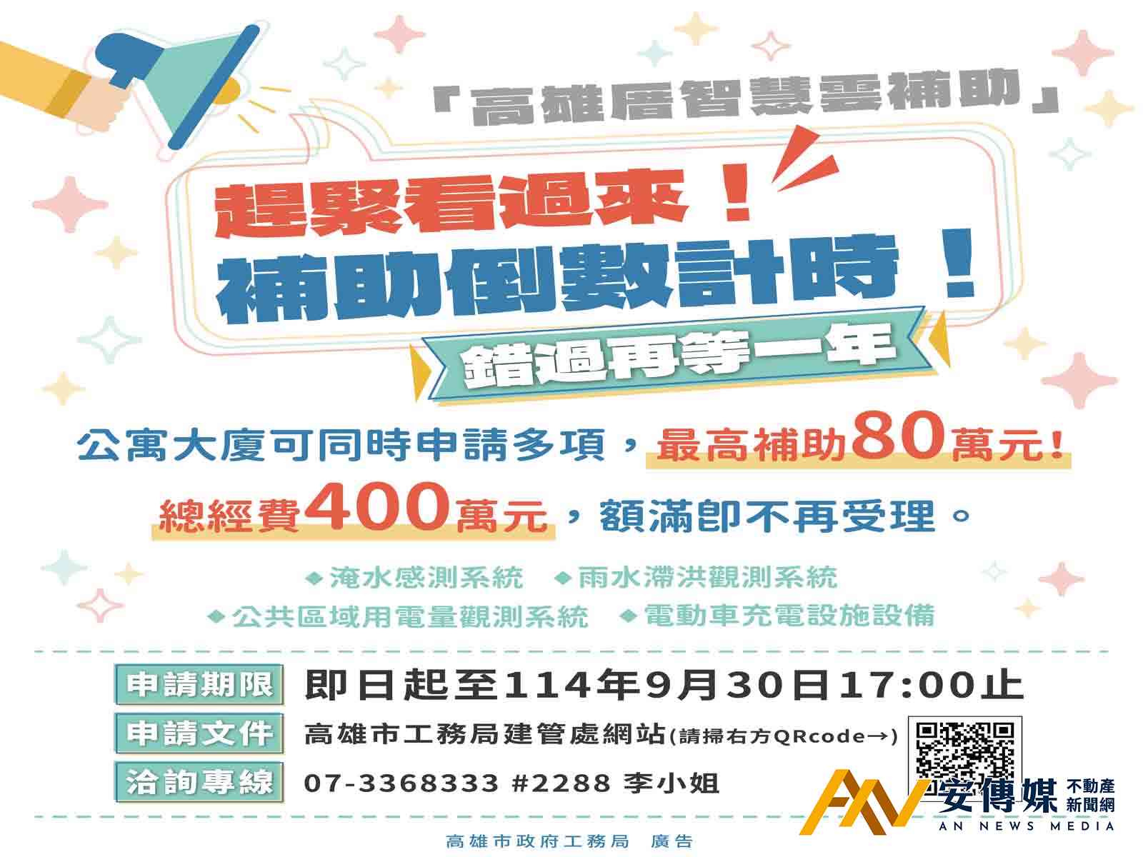 【AN不動產新聞網/劉怡霖/綜合報導】「2025年度高雄厝智慧雲補助計畫」申請受理進入最後倒數,將於9月30日截止!高雄市政府工務局提醒各公寓大廈把握機會,踴躍提出申請,2025年度補助項目包含雨水貯集滯洪設施觀測系統、淹水感測系統、公共區域用電量觀測系統,以及公共區域增設電動車充電設施設備(線槽架),總補助金額為400萬元,可同時申請多項,每一申請社區最高補助金額可達80萬元,額滿即不再受理。