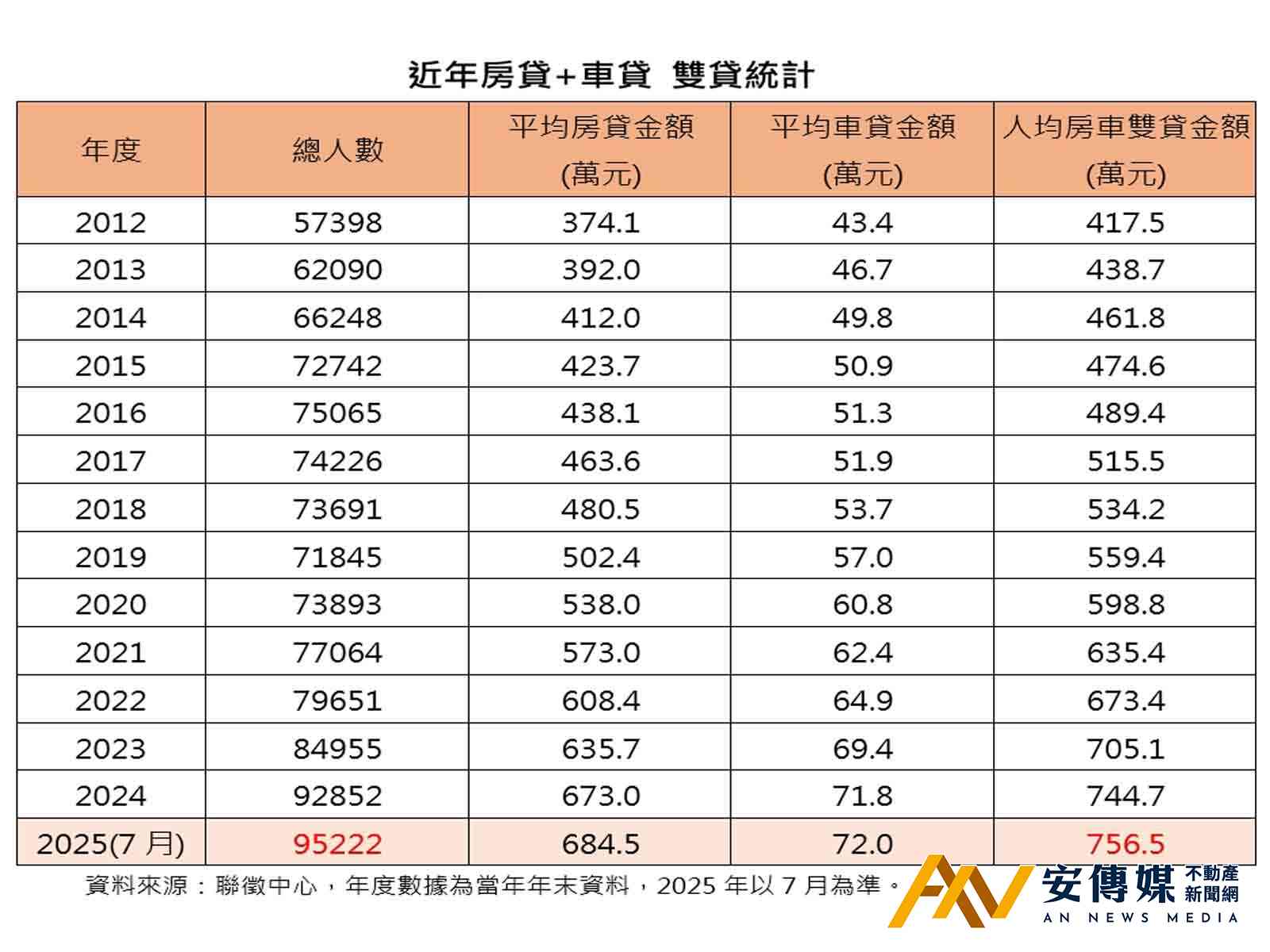 【AN不動產新聞網/蕭又安/綜合報導】現代人追求「五子登科」,娶妻生子之餘還要買房買車,雙重貸款壓力日益沉重。根據台灣房屋引用聯徵中心最新統計,截至2025年7月,全台同時背負房貸與車貸的「雙貸族」人數已突破9.5萬人,人均負債金額更高達756.6萬元,雙雙刷新歷史紀錄,甚至超越房貸加信貸的740.5萬元,凸顯現代人養房又養車的沉重經濟負擔。