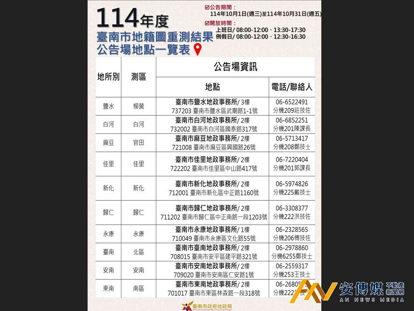 【AN不動產新聞網/劉怡霖/綜合報導】台南市政府地政局2025年度地籍圖重測結果自10月1日起至10月31日止辦理公告,重測結果通知書都以掛號寄送給各土地所有權人。市府提醒:公告期間,所有權人可以攜帶重測結果通知書與身分證,於上班時間前往土地所在地之地政事務所閱覽重測成果,例假日下午閱覽時段為12時30分至16時30分。市長黃偉哲呼籲,請所有權人務必把握公告時段親自確認重測結果,或透過「重測便民服務查詢系統」(https://cris-nlsc.moi.gov.tw/crishome)直接上網查詢重測結果,以守護自身權益。