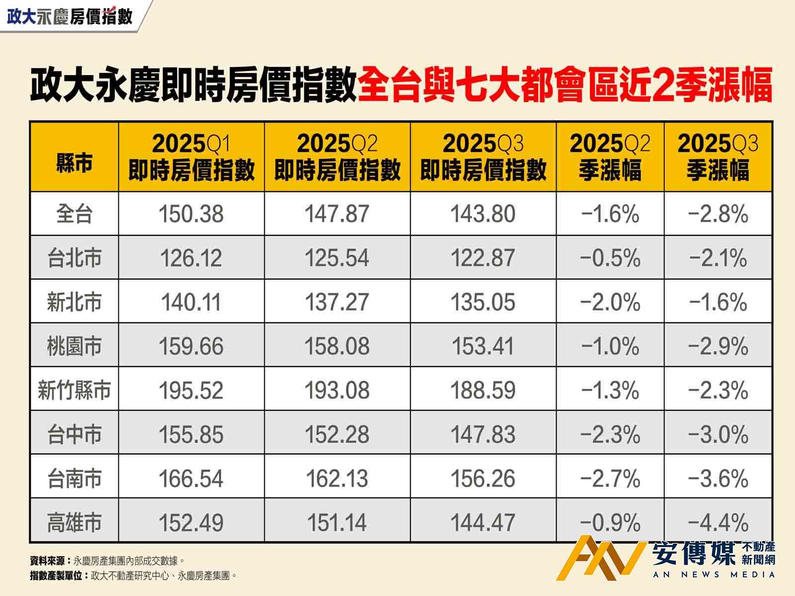 【AN不動產新聞網/蕭又安/綜合報導】最新2025Q3的「政大永慶即時房價指數」出爐,數據顯示,全台和七大都會區指數全面下跌,且跌幅有擴大的趨勢,本季全台指數跌幅為2.8%。細看到各都的表現,台中、台南和高雄指數跌勢最明顯,季跌幅皆逾3%,桃園跌幅2.9%,新竹縣市跌幅2.3%,台北、新北跌幅較輕,跌幅約在2%上下。
