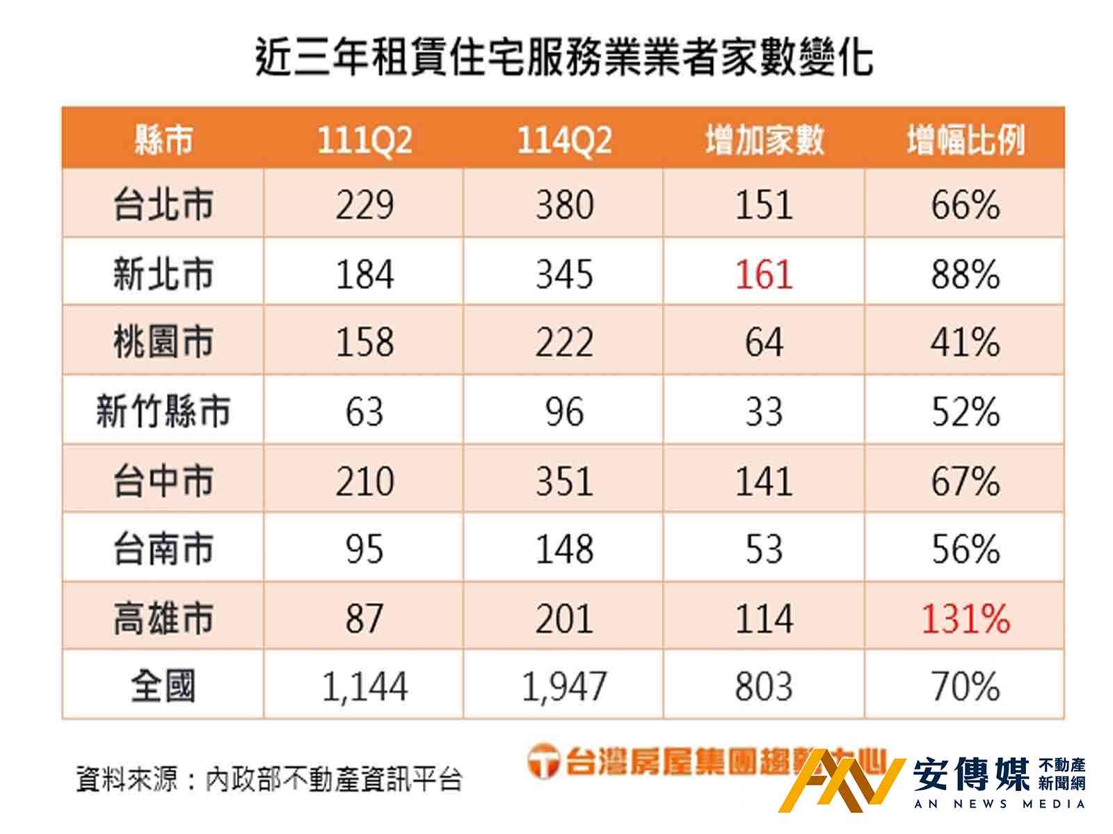 【AN不動產新聞網/蕭又安/綜合報導】包租代管業蓬勃發展觀察內政部不動產平台資料,近3年租賃住宅服務業業者家數變化,2025年Q2為止,全國租賃住宅服務業業者1947家,跟3年前同期相較,增加了803家,增幅達70%,而六都加新竹縣市中,以新北市數量增加161家最多,但總數量仍以台北市最多,2025年Q2已有380家住宅服務業者登記營業。
