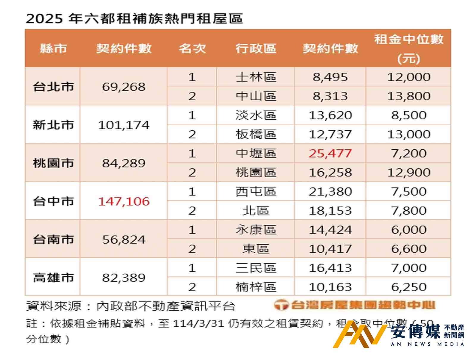 【AN不動產新聞網/蕭又安/綜合報導】租屋補助放寬,越來越多人受惠!台灣房屋集團趨勢中心觀察內政部租金補貼統計資訊,2025年第一季全國補貼核撥戶數共52.5萬筆,較2024年同期增加14.6萬筆,2024年第一季時的年增量也達13.9萬筆,顯示政府逐漸放寬租金補貼的條件,以及提供房東各項稅賦優惠後,民眾響應租金補貼政策的意願大增。而六都中以台中市租屋契約件數最多,達14.7萬件,其次是新北市10.1萬件。