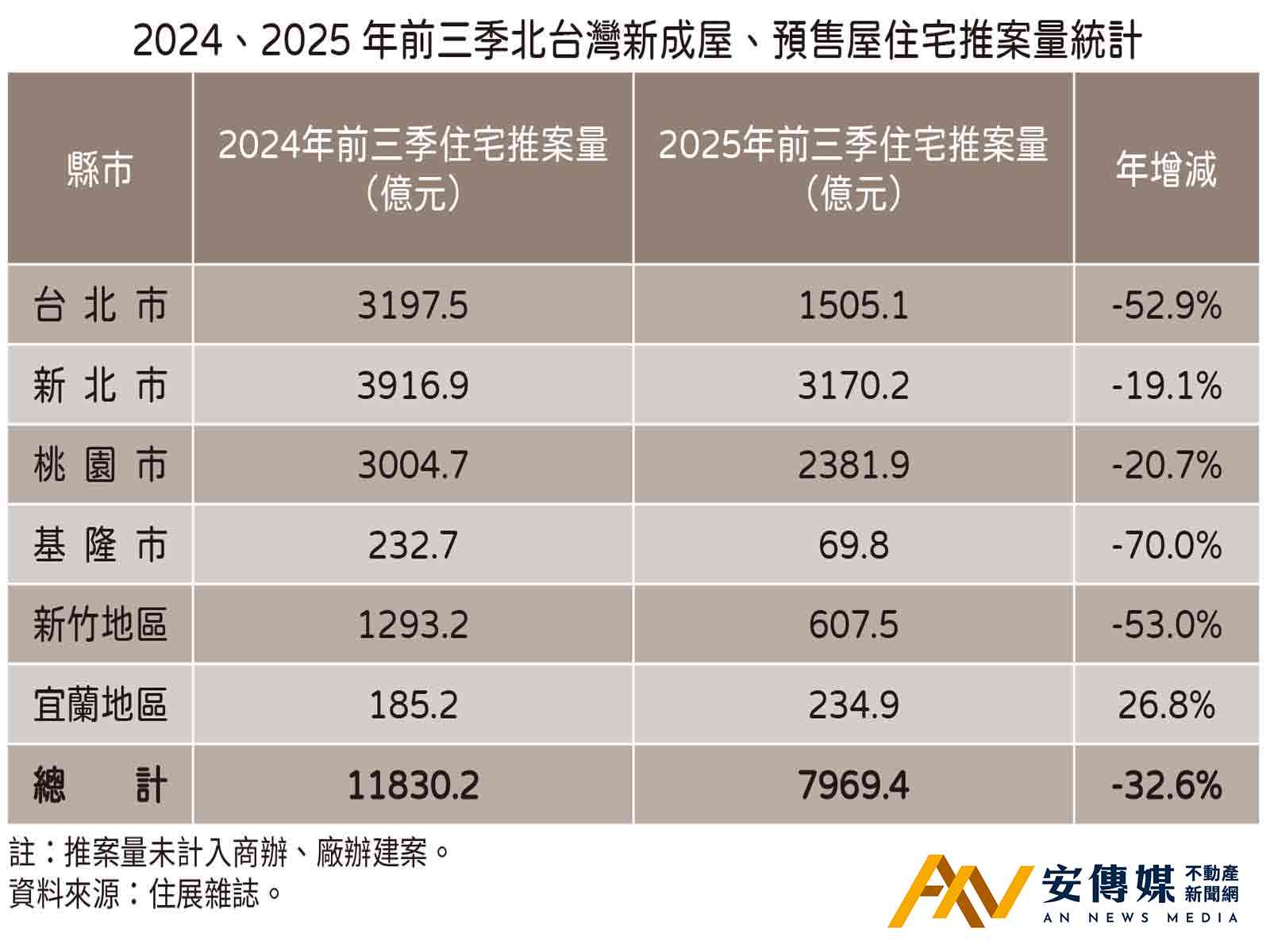 【AN不動產新聞網/蕭又安/綜合報導】住展雜誌統計,北台灣2025年前三季住宅類新成屋、預售屋總推案量約7969.4億元,年減3860.8億元,減幅32.6%,與2024年前三季就已破兆元的順風順水情勢大相逕庭。