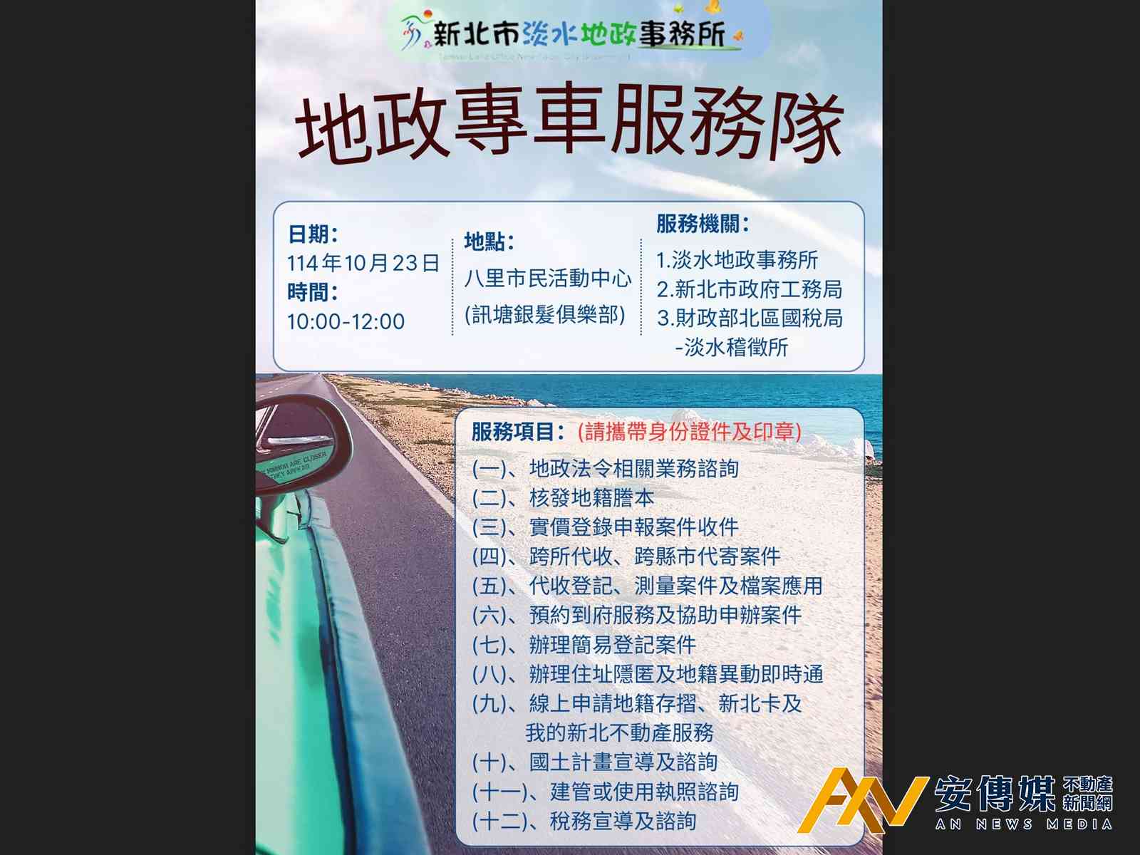 【AN不動產新聞網/劉怡霖/綜合報導】新北市淡水地政事務所「地政專車」將於2025年10月23日,巡迴至八里區八里市民活動中心(訊塘銀髮俱樂部)進行服務,現場提供地政法令諮詢、地籍謄本核發、跨縣市代收代寄案件、代收登記、測量案件及檔案應用、辦理簡易登記案件、辦理住址隱匿及地籍異動即時通、國土計畫新制介紹等服務。此外,本次活動特別邀請到新北市政府工務局、及財政部北區國稅局淡水稽徵所一同參與,提供建管或使用執照及稅務諮詢等相關業務服務,歡迎民眾多加利用。