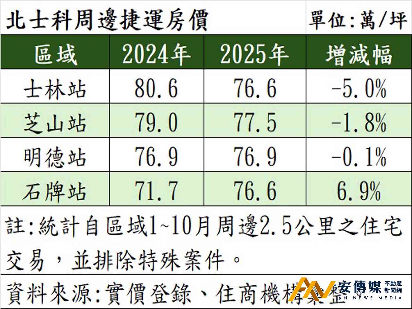 另觀察統計,亦有鄰近北士科議題的捷運石牌站周邊,2025年截至10月平均成交行情來到每坪76.9萬元,與2024年同期相比上漲6.9%,為北士科周邊捷運站中唯一呈現漲勢的區域。住商不動產石牌捷運加盟店店東楊倉池分析,石牌站周邊除有北士科議題,又有石牌市場改建案加持,且客群除在地客、換屋族之外,亦由於鄰近台北榮總、振興醫療,磁吸醫療人員置產,整體市場需求充足,房市前景又具可看性,因此價格有不小的支撐力道。
