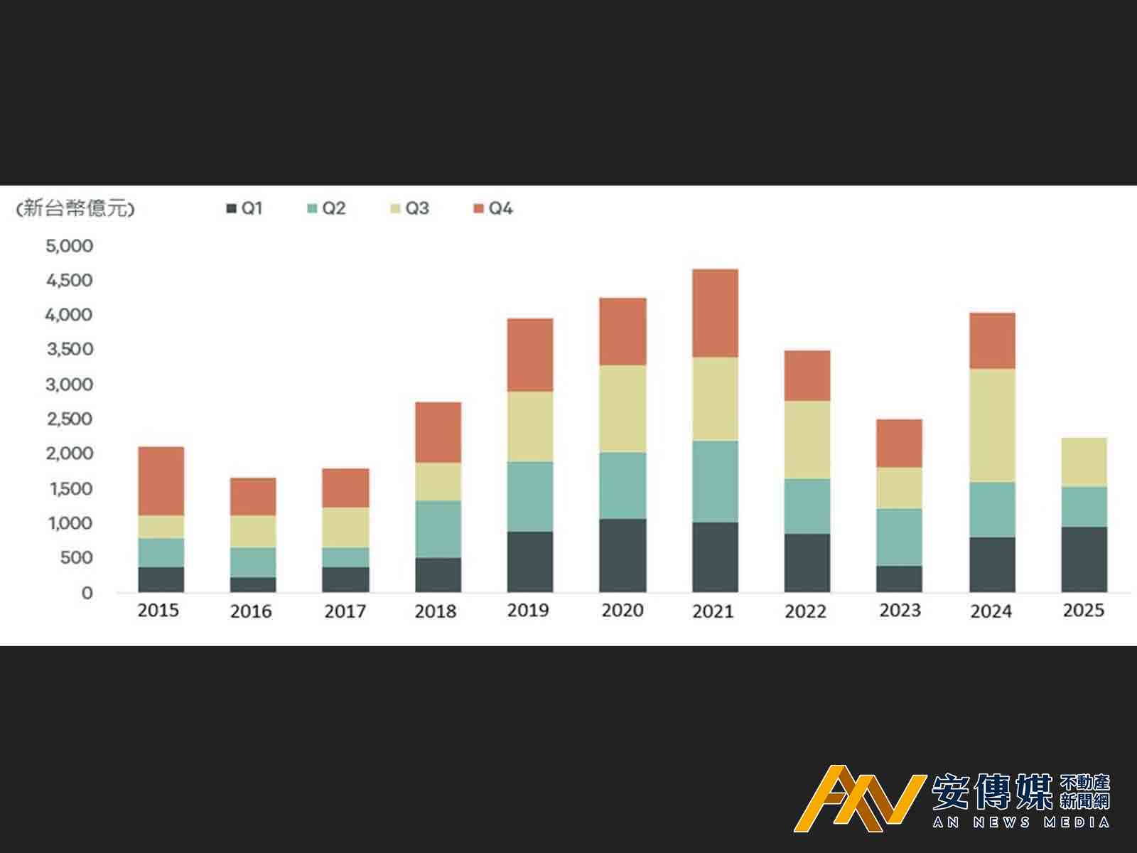【AN不動產新聞網/蕭又安/綜合報導】據世邦魏理仕研究部統計,2025年第三季全台大型土地及商用不動產成交金額為704億元,較上季成長22%,但較2024年同期下滑57%。分析交易量衰退原因,除了受到2024年第三季高基期的影響, 自2024年9月實施第七波信用管制起,住宅市場買氣大降,加上銀行放貸態度趨嚴,促使建商購地腳步明顯放緩,導致2025年第三季土地市場交易量年減71%,成交額僅新台幣320億元,創兩年多來單季最低紀錄。