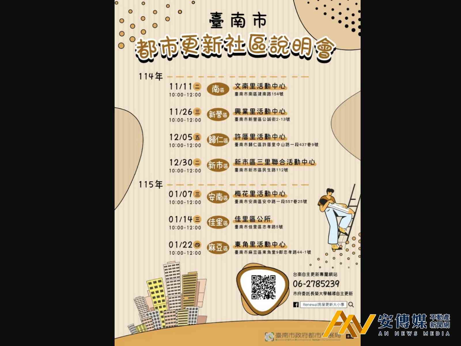 【AN不動產新聞網/劉怡霖/綜合報導】為協助市民了解都市更新相關補助政策與辦理流程,台南市府都市發展局於2025年7月至10月辦理7場次都市更新社區說明會,獲得民眾熱烈反應,將於2025年11月11日起啟動第二階段都市更新社區說明會,陸續在南區、新營區、歸仁區、新市區、安南區、佳里區及麻豆區等地舉辦共7場次,有意了解自主更新的民眾,請踴躍參與。