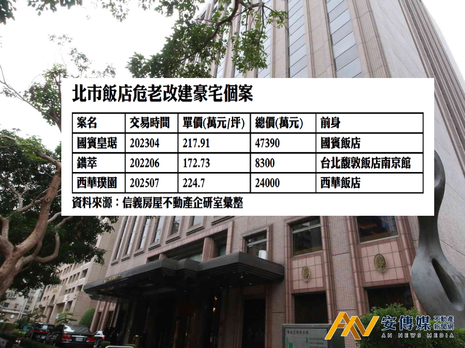 另一個飯店改建豪宅的經典案例則是「國賓皇琚」,2023年曾揭露總價4.7億元,每坪217.9萬元的紀錄,實價共揭露68筆,總銷售金額超過百億元,另一筆危老改建則是南京東路上的「鐫萃」,前身則是台北馥敦飯店南京館,實價揭露單價也出現每坪172.7萬的紀錄。