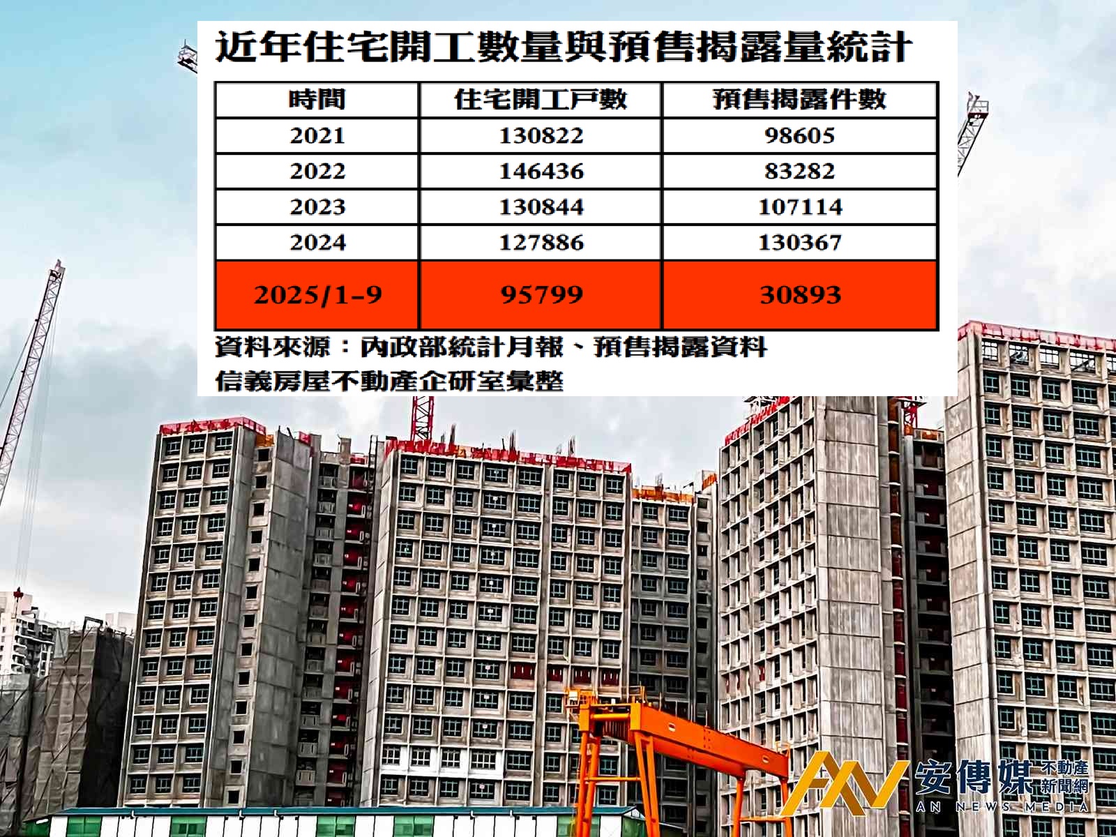 【AN不動產新聞網/蕭又安/綜合報導】統計建案開工與預售揭露量表現,2023年受惠9月開始預售屋交易轉熱,當年度報開工戶數達13.1萬戶,預售揭露也達10.7萬戶,2024上半年交易火熱,預售揭露全年達到13萬戶,甚至超過當年報開工的12.8萬戶,2025年則是賣得遠比開工量還少很多,預售揭露前三季只賣了3萬戶,全年推估剩下2024年的3成,但2025年全年的開工數量推估將達11萬戶,若外在環境沒有出現轉機,長期新建餘屋可能會逐漸增加。