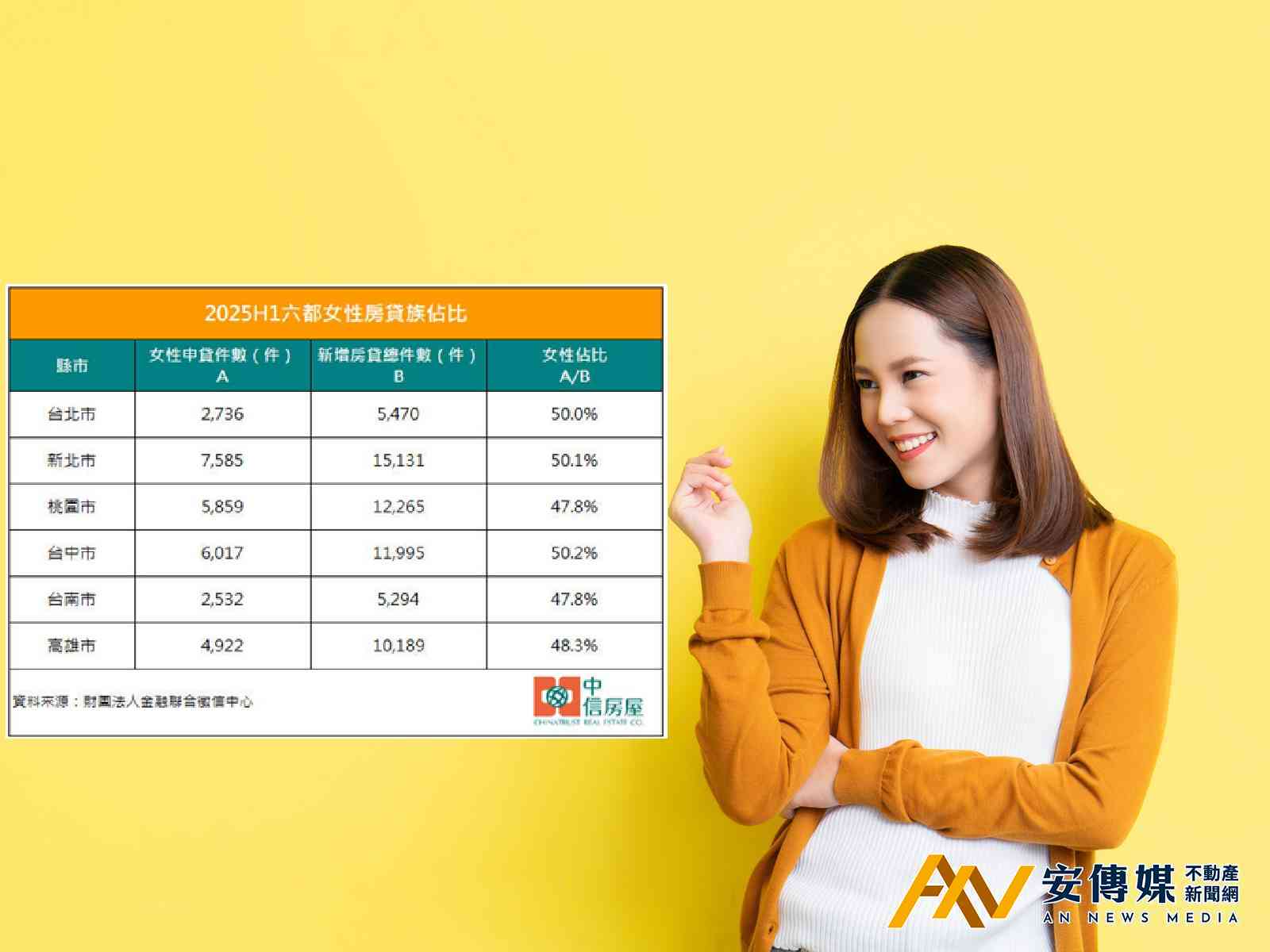 【AN不動產新聞網/蕭又安/綜合報導】現代女性在各領域的影響力持續提升,購屋能力也日益增強。中信房屋研展室彙整財團法人金融聯合徵信中心資料顯示,2025年上半年全台女性房貸族的新增房貸件數為36,818件,占新增房貸總件數75,395件的48.8%,不僅逼近半數,更創下2012年以來同期新高,顯見女性客戶已成為房市不可忽視的重要力量。對此,中信房屋研展室副理莊思敏指出,現代女性的社會地位與就業環境早已今非昔比,加上女性普遍更追求生活與居住的安全感,所以女性客戶在不動產市場中的確愈來愈有話語權。