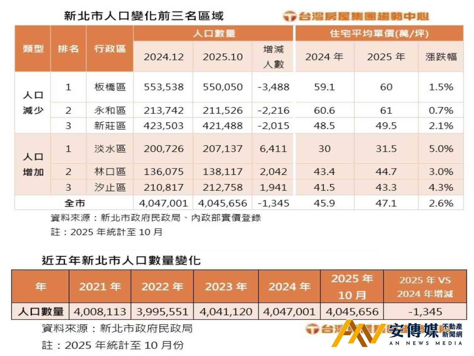 【AN不動產新聞網/蕭又安/綜合報導】新北市也出現脫北潮?!台灣房屋集團趨勢中心統計新北市民政局各區戶籍人口數量,從2022年起連年增加,不過2025年卻出現轉折,截至2025年10月最新數字,新北市404萬5656人,和2024年底相比,10個月來減少1345人,其中又以板橋區減少3488人居新北之最,其次的永和、新莊區則皆減少約2千多人,新北人口逐漸流失中。