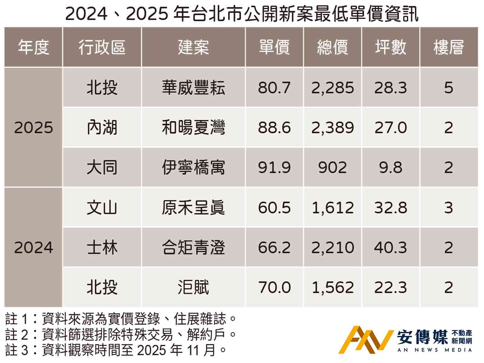 【AN不動產新聞網/蕭又安/綜合報導】住展雜誌彙整高房價台北市在2024、2025年公開之住宅類預售新案,截至11月實價揭露的最低單價三案資訊,2024年是文山區政大山區的「原禾呈真」、士林區社子地區的「合矩青澄」,與北投區復興崗一帶的「洰賦」,單價各是60.5萬元、66.2萬元、70萬元。2025年則為北投區復興崗區域的「華威豐耘」、內湖區四期重劃區的「和暘夏灣」,和大同區延三夜市地帶的「伊寧橋寓」,每坪交易80.7萬元、88.6萬元,以及91.9萬元。