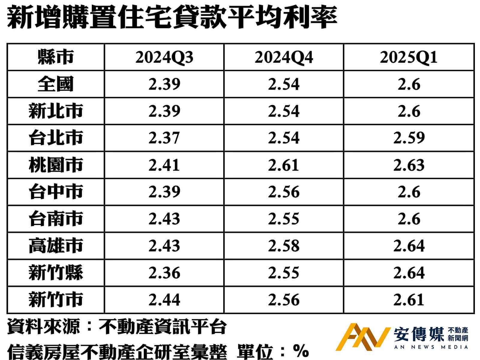 【AN不動產新聞網/蕭又安/綜合報導】根據不動產資訊平台顯示,不包含優惠房貸的一般房貸利率,2025年第一季平均新增房貸的平均利率為2.6%,寫下金融海嘯後的新高,比較特別的是房貸利率通常跟央行升息有關,但過去這段時間利率已經沒有調升,但新增房貸的利率較2024第二季仍增加了0.24個百分點。
