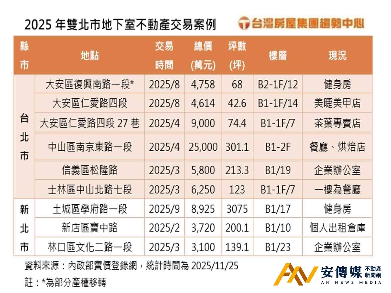 台灣房屋集團趨勢中心進一步觀察雙北市的地下室店面交易,其中交易總金額最高的為台北市中山區南京東路一段的一、二樓帶地下一樓店面,總價2.5億元,目前由連鎖餐飲集團的旗下三個品牌經營中。新北市新店區寶中路純地下室物件,2025年交易總價3720萬元,地下室作為個人出租倉庫租用。