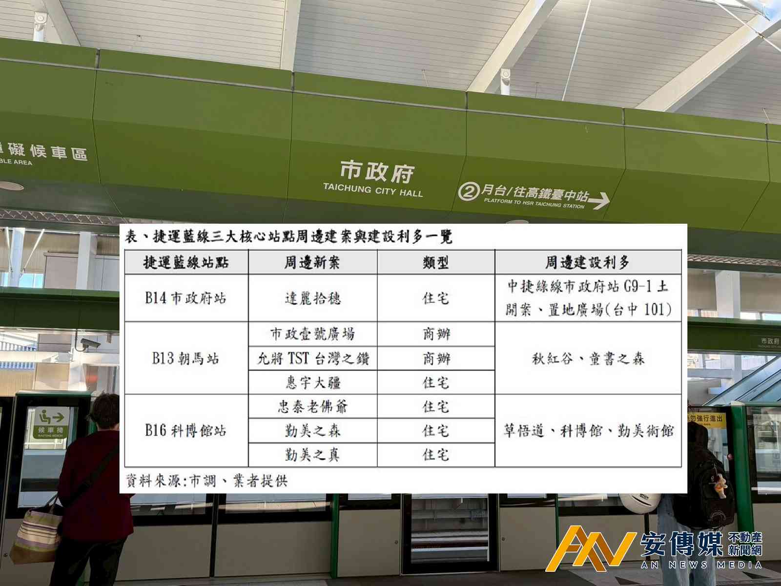 【AN不動產新聞網/蕭又安/綜合報導】隨著台中捷運藍線正式動工,沿線房市發展再度成為市場焦點。雖然藍線尚未通車,但軌道建設效應已提前反映在預售市場,建商積極卡位藍線所經區段,瞄準未來通車後的通勤效率與預期人流。其中,B14市政府站、B16科博館站與B13朝馬站因兼具交通節點突出及周邊商圈成熟,又有大型開發案陸續進場,被市場視為藍線含金量最高的三大核心站點。同時,這三站周邊的新案成交表現也相對亮眼,是目前藍線沿線中平均單價與總價帶均站上最高級距的區段,也吸引達麗、忠泰、勤美、允將、興富發和惠宇等品牌建商相繼插旗。
