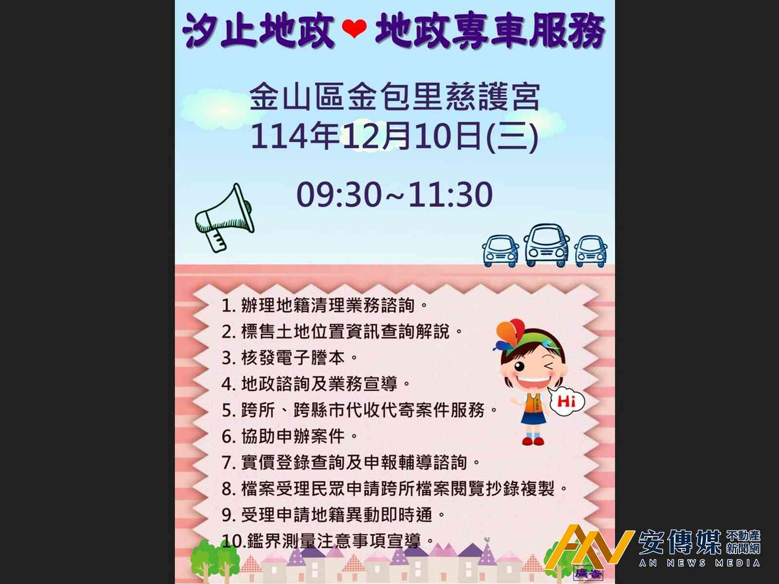 【AN不動產新聞網/方暮晨/綜合報導】想諮詢地政問題卻沒時間跑地政事務所嗎?汐止地政事務所將於12月10日(星期三)上午9時30分至11時30分在金山區金包里慈護宮為您服務,本次服務教您如何使用AI智能客服「新北地政通」,讓您不論白天黑夜,隨時隨地都能輕鬆查詢地政業務!「新北地政通」支援國語、台語、英語三種語言,登記、測量、地價、土地開發等問題通通問得到,省時又便利。
