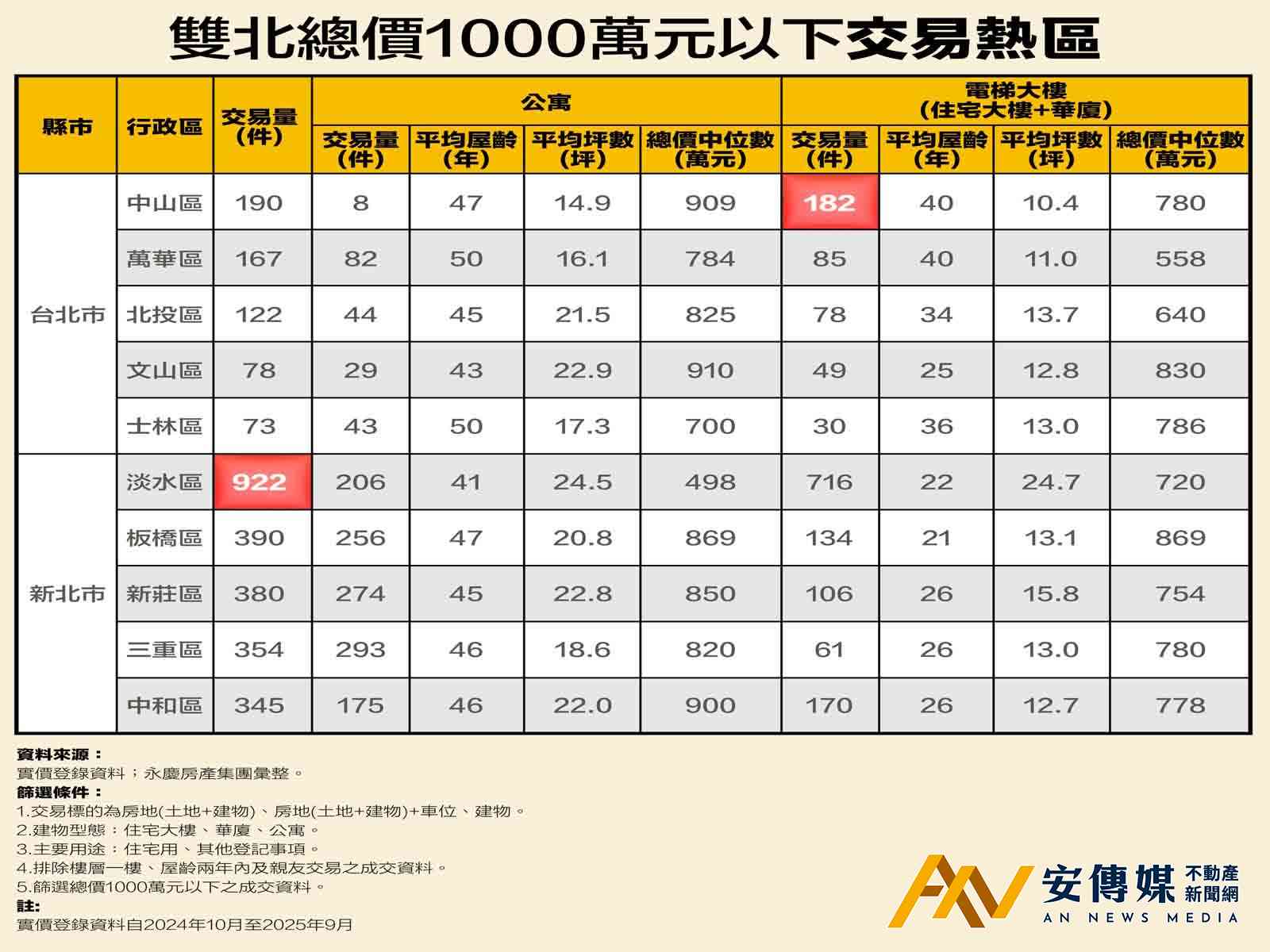 在新北市,淡水區總價千萬元內的公寓和大樓產品近一年交易量高達922件,顯示消費者到淡水區尋覓親民房價的住宅最有機會。陳金萍分析,淡水區距離北市核心區較遠,因此整體房價相當親民。若願意用時間換取空間,總價千萬元以內仍可購得約25坪,多規劃為2-3房的大樓和公寓住宅。而公寓雖然總價中位數不到500萬元,不過千萬元以下交易平均屋齡多落在41年左右,屋齡偏高。但以雙北來看淡水區已算是相當經濟實惠的區域,也成為許多小家庭的熱門購屋首選。