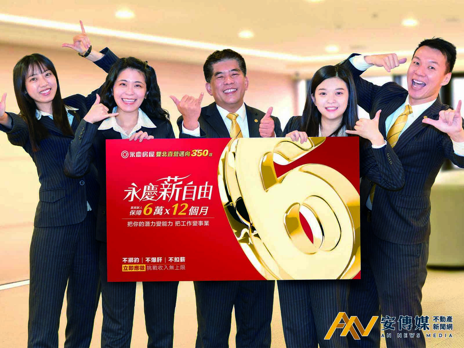 永慶房屋透過人資制度建立優良的職場環境,提供業務新人保障前12個月每月6萬元的高收入,業務月排休最高10天,並結合AI創新科技、團隊合作與完善的福利,打造兼具「高效率、高收入與高生活品質」的幸福職場環境。並宣布啟動大展店計畫,設定雙北展店目標邁向350店,前瞻布局迎接下波房市成長機會,歡迎對房地產有興趣的求職者一起加入永慶。