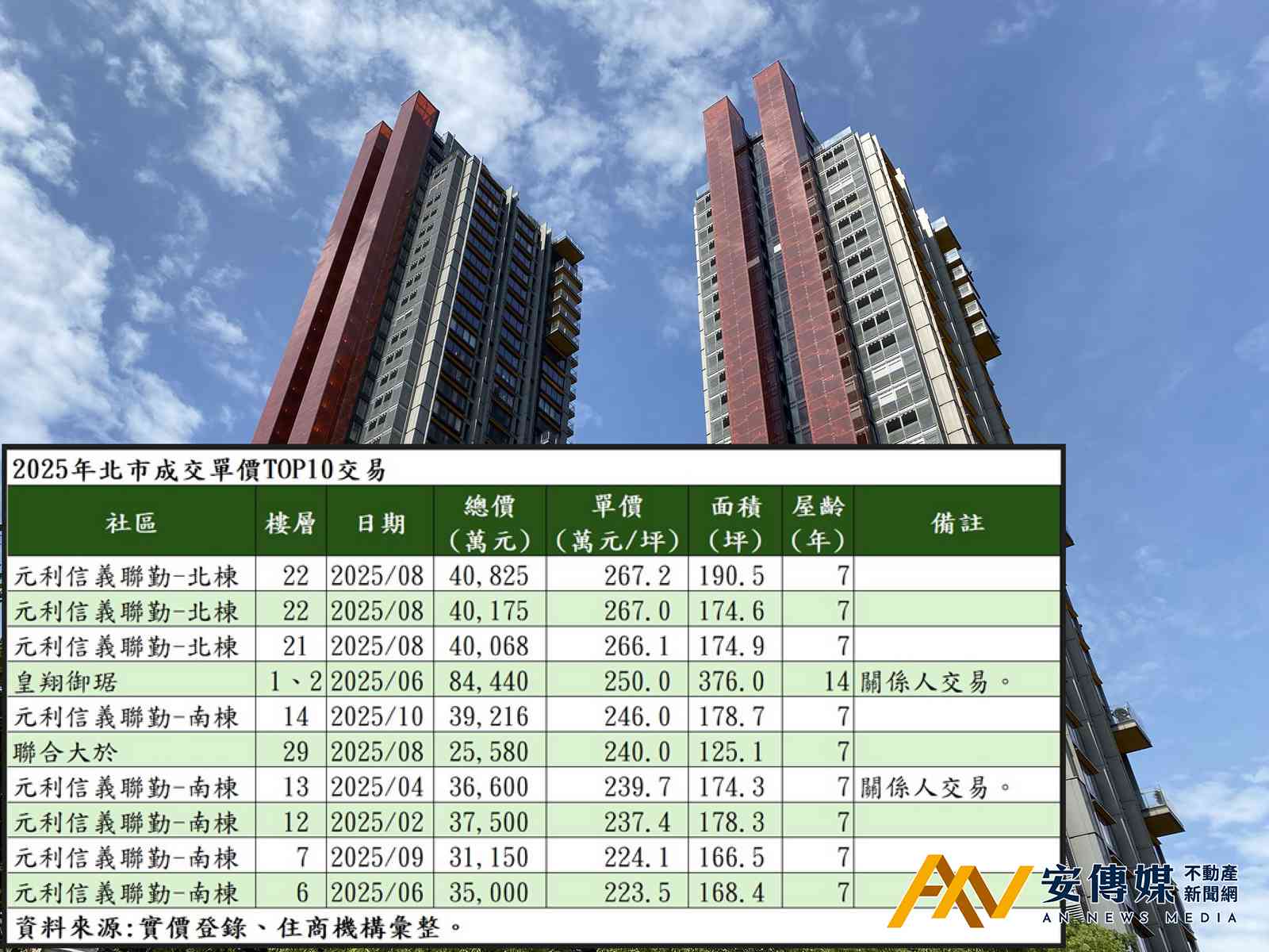 【AN不動產新聞網/蕭又安/綜合報導】房市雖冷颼颼,惟高資產族群仍積極進場。住商機構觀察實價登錄,指標豪宅「元利信義聯勤-北棟」22樓2戶8月中旬同日交易,成交總價共達8.1億元,成交單價約267餘萬元,且並無貸款,這筆交易也成為目前2025年的豪宅單價王。