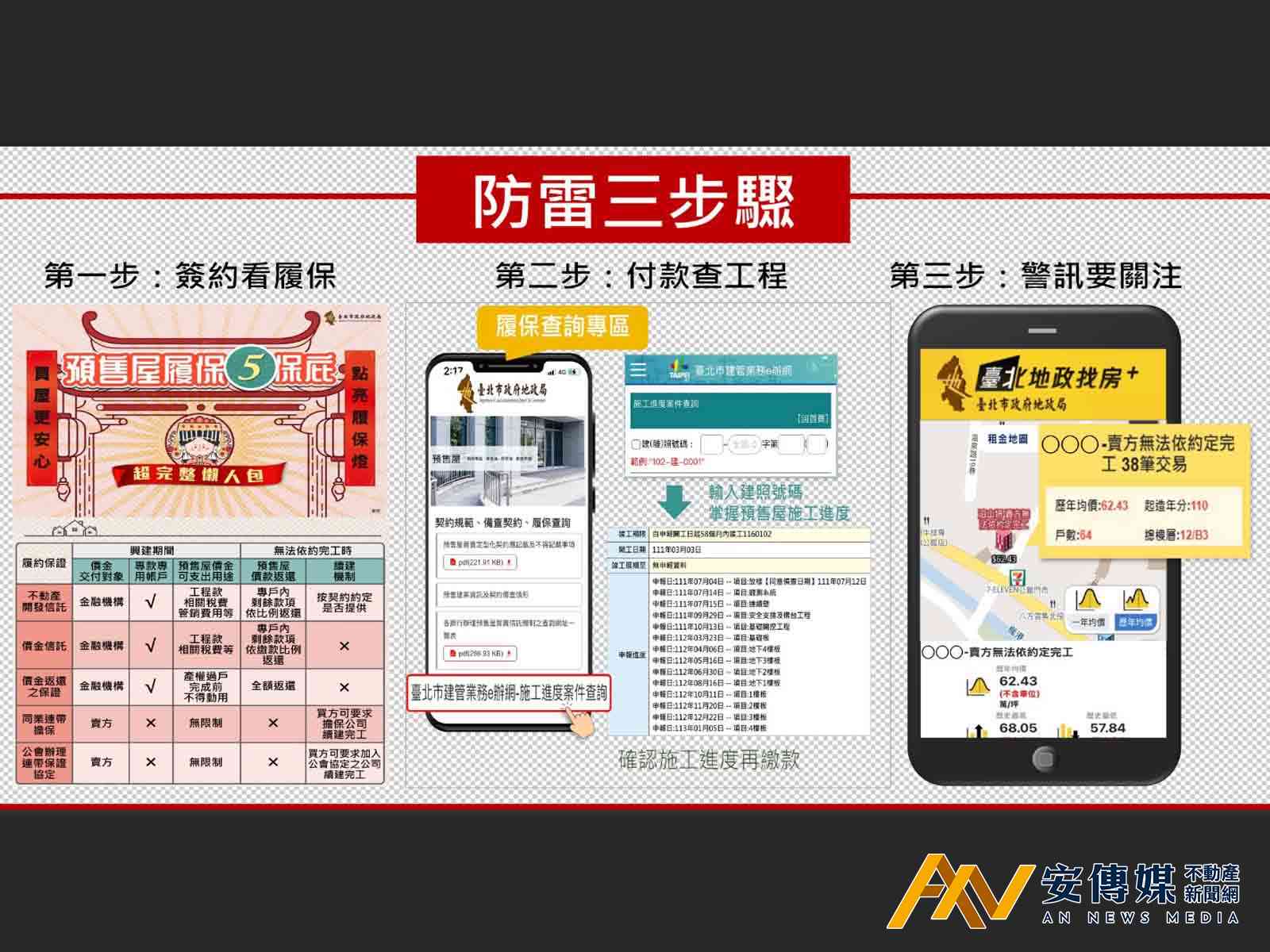 第2步:付款必查「施工進度」–預售屋工期長,建商若發生資金問題,恐影響施工進度。北市政府地政局全國首創「履約擔保資訊專區」,民眾付款前應主動透過地政局官網,連結至建管業務e辦網,查詢建案實際施工情形,並留意除簽約款及開工款外,其餘價款應依工程進度分期繳交,避免「工程沒動、錢卻先付」的風險。