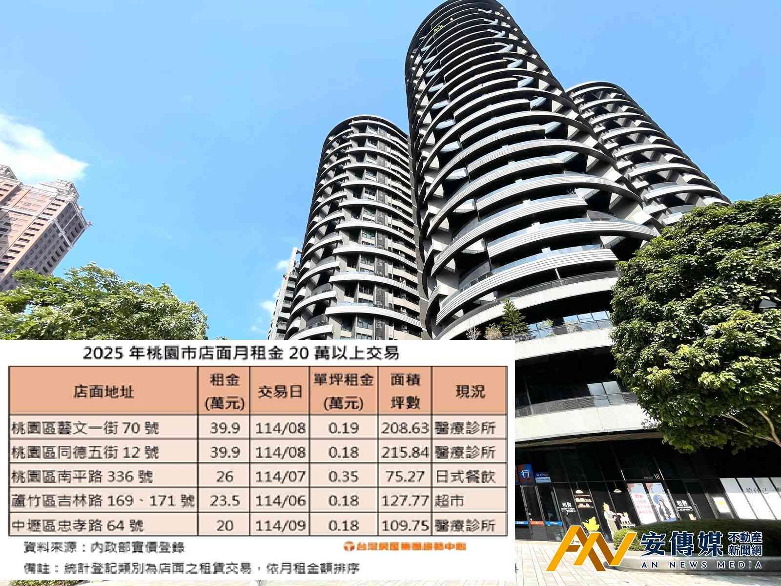 台灣房屋集團趨勢中心進一步統計,2026年桃園市月租金超過20萬的店面租賃交易共五筆,其中前三名都在桃園區,同在藝文特區內的南平路,也有一筆26萬月租,由日本連鎖快餐料理承租;蘆竹區吉林路的金店面月租金23.5萬,目前是家樂福營業中;而中壢區忠孝路原藥妝店,現在由醫療診所成租。