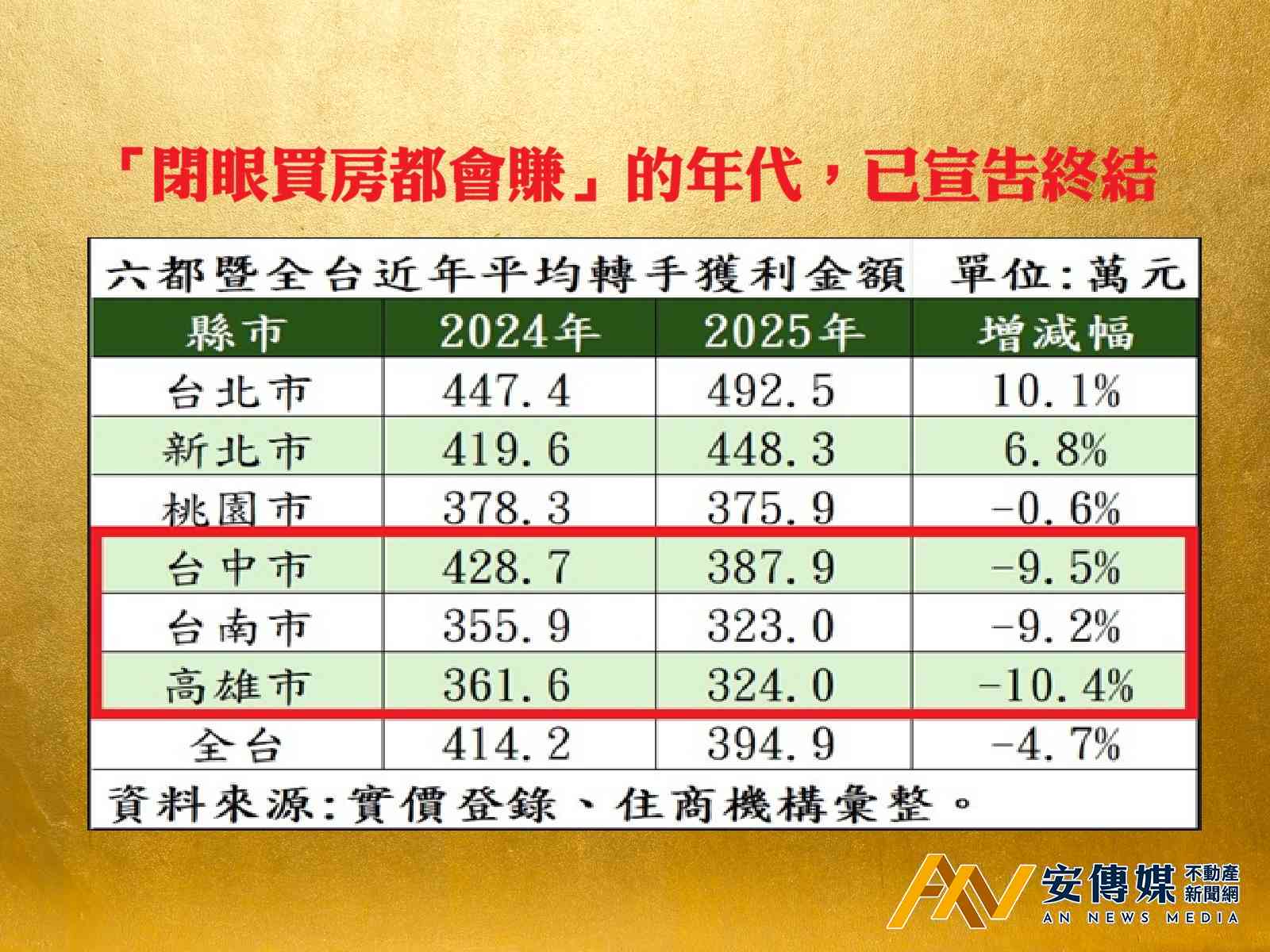 【AN不動產新聞網/蕭又安/綜合報導】房市寒流襲來,全台屋主售屋獲利皆有所縮減。根據住商機構統計實價資料,2025年全台售屋平均獲利金額約縮水4.7%;不過,雙北房市仍展現出韌性,其中房價最高的台北市,不僅轉手平均獲利492.5萬元居六都冠軍,且年增1成也是六都最高。大家房屋企劃研究室公關襄理賴志昶指出,大環境變遷之下,資金明顯回防蛋黃區,具成熟機能與剛性需求的都會區,房價更具支撐力道。